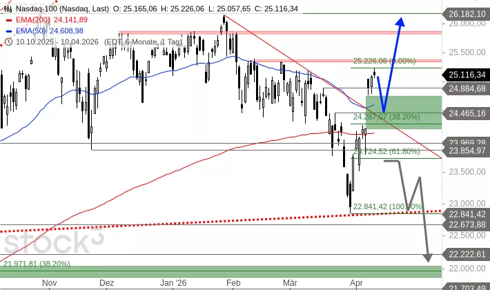 Der Nasdaq 100 fiel am 30. März 2026 auf ein Tief bei 22.841 Punkten. Seitdem zieht der Index wieder deutlich an. Am 08. April riss er ein Aufwärtsgap zwischen 24.209 und 24.756 Punkten. Damit übersprang er den Abwärtstrend, der seit dem Scheitern am Allzeithoch vom 28. Januar 2026 bestand. In den Folgetagen legte der Index weiter zu und erreichte am Freitag ein Hoch bei 25.226 Punkten.