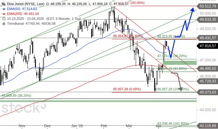 Der Dow Jones fiel nach seinem Rekordhoch vom 10. Februar 2026 auf das alte Allzeithoch aus dem Dezember 2024 bei 45.073 Punkten zurück. Dort drehte der Index am 30. März wieder nach oben. Am Donnerstag markierte er ein Hoch bei 48.323 Punkten und kletterte damit an die Widerstandszone um 48.431 Punkte. Das Hoch wurde zum Anlass für erste Gewinnmitnahmen, und die jüngste Aufwärtsbewegung stoppte.
