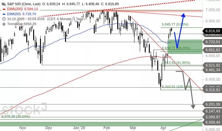 Der S&P 500 startete am 30. März 2026 nach einem Tief bei 6.316 Punkten zu einer starken Erholung. Diese führte den Index am Freitag auf 6.845 Punkte. In dieser Rally riss er am 08. April ein Aufwärtsgap zwischen 6.680 und 6.740 Punkten und kletterte anschließend auf 6.845 Punkte.