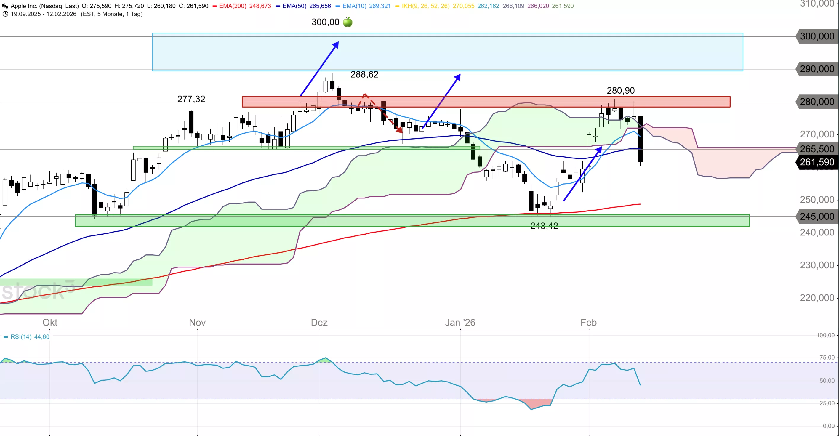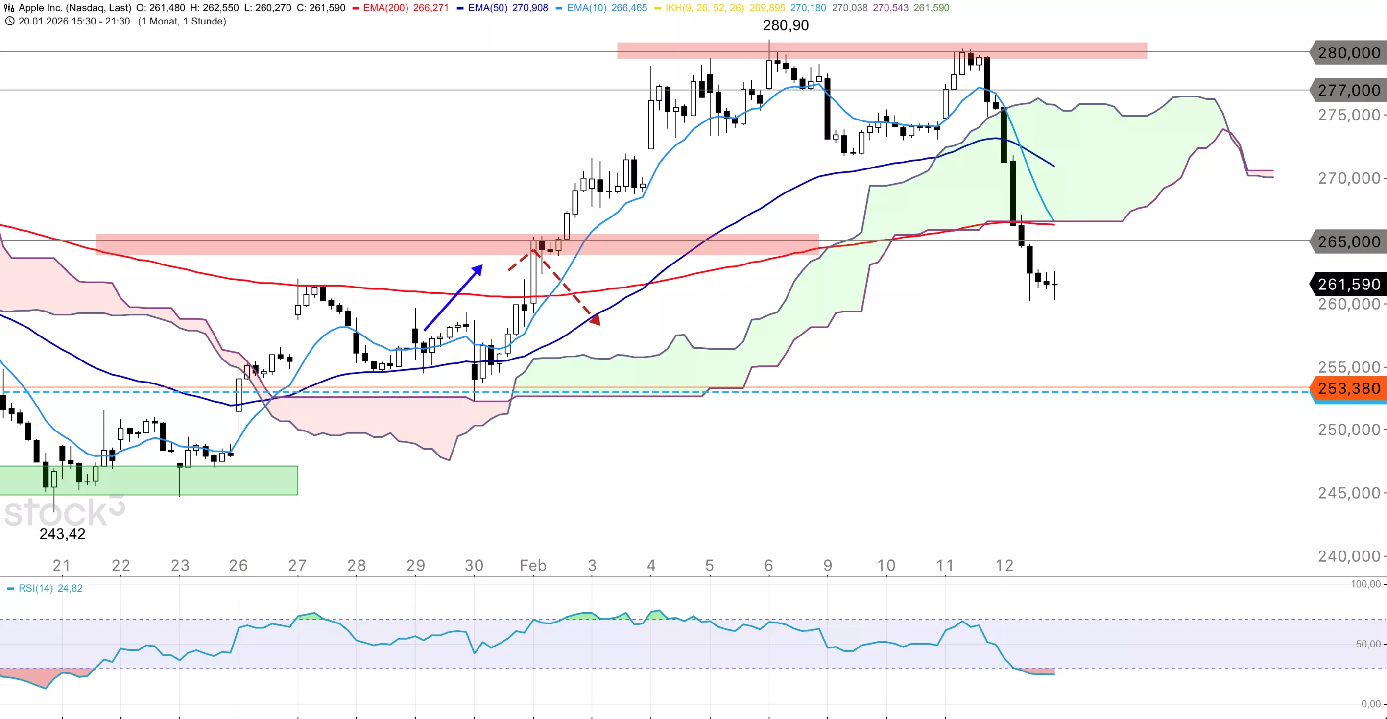 Die Apple-Aktie hat nach dem Verlaufshoch bei 288,62 USD im Dezember eine Korrektur eingeleitet und notiert aktuell unter dem 50er-EMA bei 265,66 USD und dem 10er-EMA bei 269,32 USD. Im Januar bildete der Titel ein Tief bei 243,42 USD, erholte sich bis 280,90 USD, scheiterte dort aber an der Widerstandszone. Am Vortag verlor das Papier rund 5 % und rutschte unter die Ichimoku-Wolke im Tageschart. Per Börsenschluss ging das Papier mit einem KGV von 30,95, einem fairen Wert von 246,60 USD und einem Analystenkursziel von 297,49 USD bei 261,59 USD aus dem Handel.