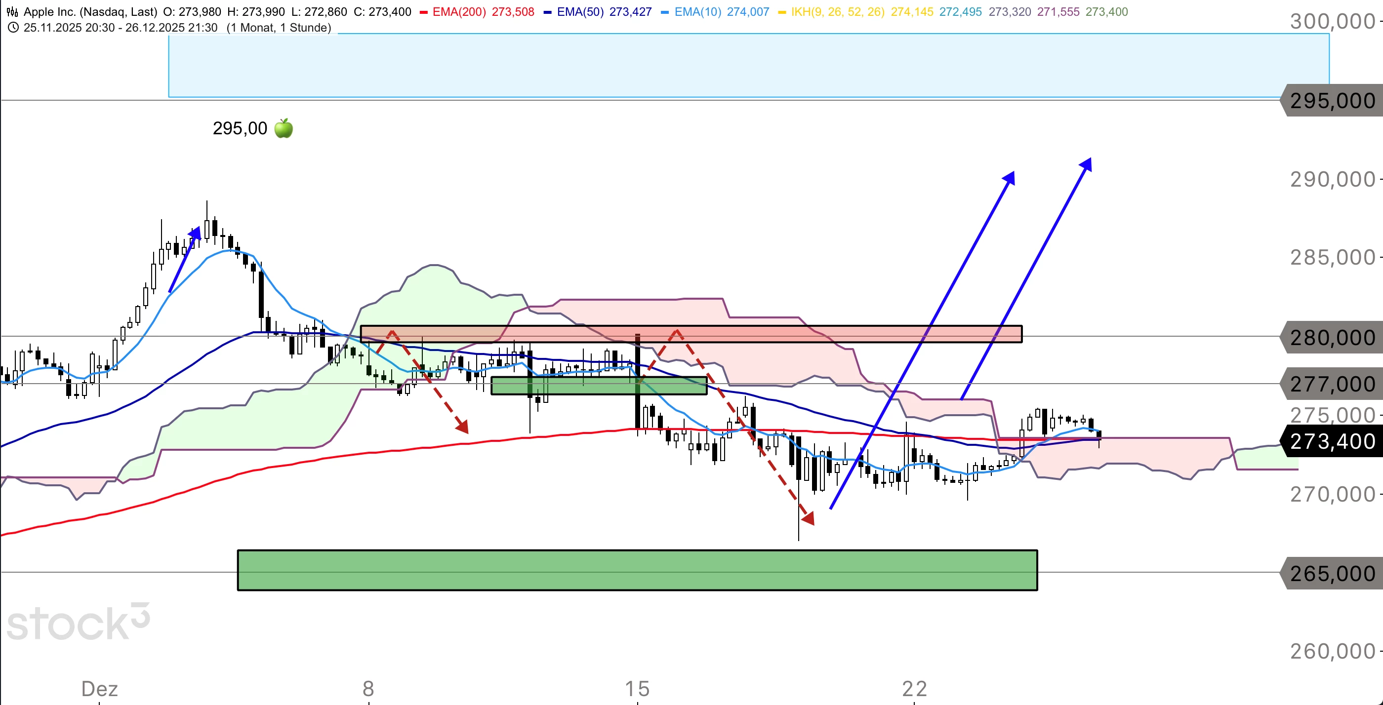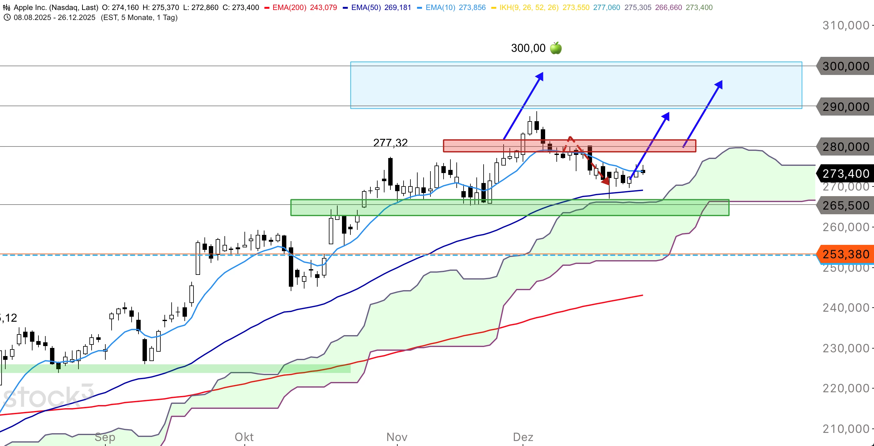 Die Apple-Aktie ist nach dem Verlaufshoch vom 03. Dezember bei 288,62 USD in eine Korrektur übergegangen und dabei unter die wichtige Marke von 280,00 USD sowie unter den 10er-EMA gefallen. Damit wurde ein Schwächesignal generiert und das Papier rutschte weiter bis zum 50er-EMA bei 266,95 USD ab. Hier konnte sich die Apple-Aktie fangen und wieder nach oben abprallen. Aktuell kämpft der Titel mit dem 10er-EMA im Tageschart, der bei 273,85 USD verläuft. Am Vortag ging die Aktie bei 273,40 USD aus dem Handel.