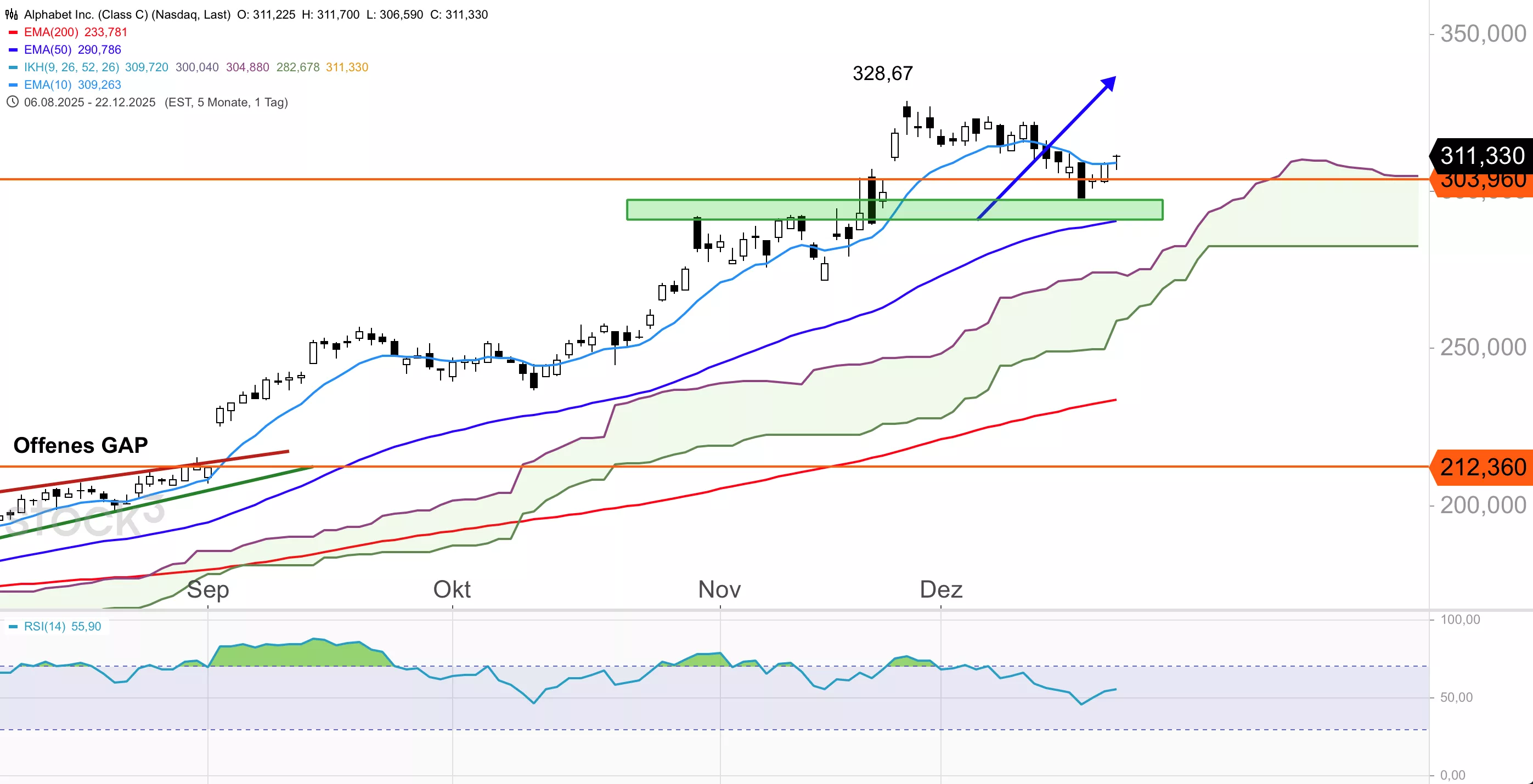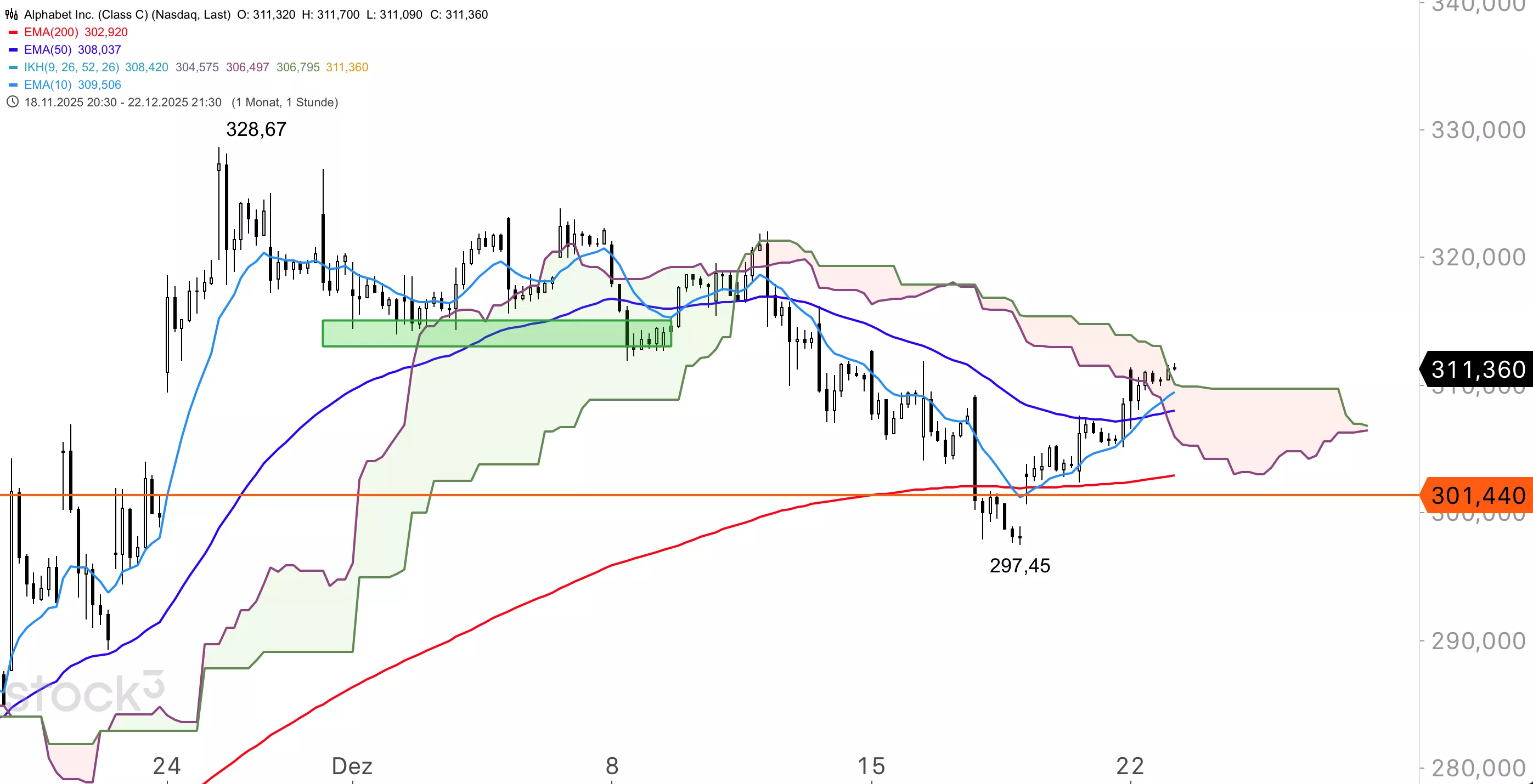 Die Alphabet-Aktie hatte in der jüngsten Korrektur das zuvor noch offene Gap um 303,96 USD geschlossen und zog dann wieder hoch. Mit dem Durchbruch aus der Ichimoku-Wolke im Stundenchart hat sich die Lage weiter aufgehellt. Die Aufwärtsbewegung sollte sich fortsetzen, zumal die Aktie ab Januar bis Anfang Februar mit starkem saisonalen Rückenwind rechnen kann. Ab Februar ist aber saisonal eher mit einer Korrektur bis Ende März zu rechnen, laut Durchschnittsdaten der vergangenen 10 Jahre. Das durchschnittliche Analystenkursziel liegt aktuell um 334 USD.