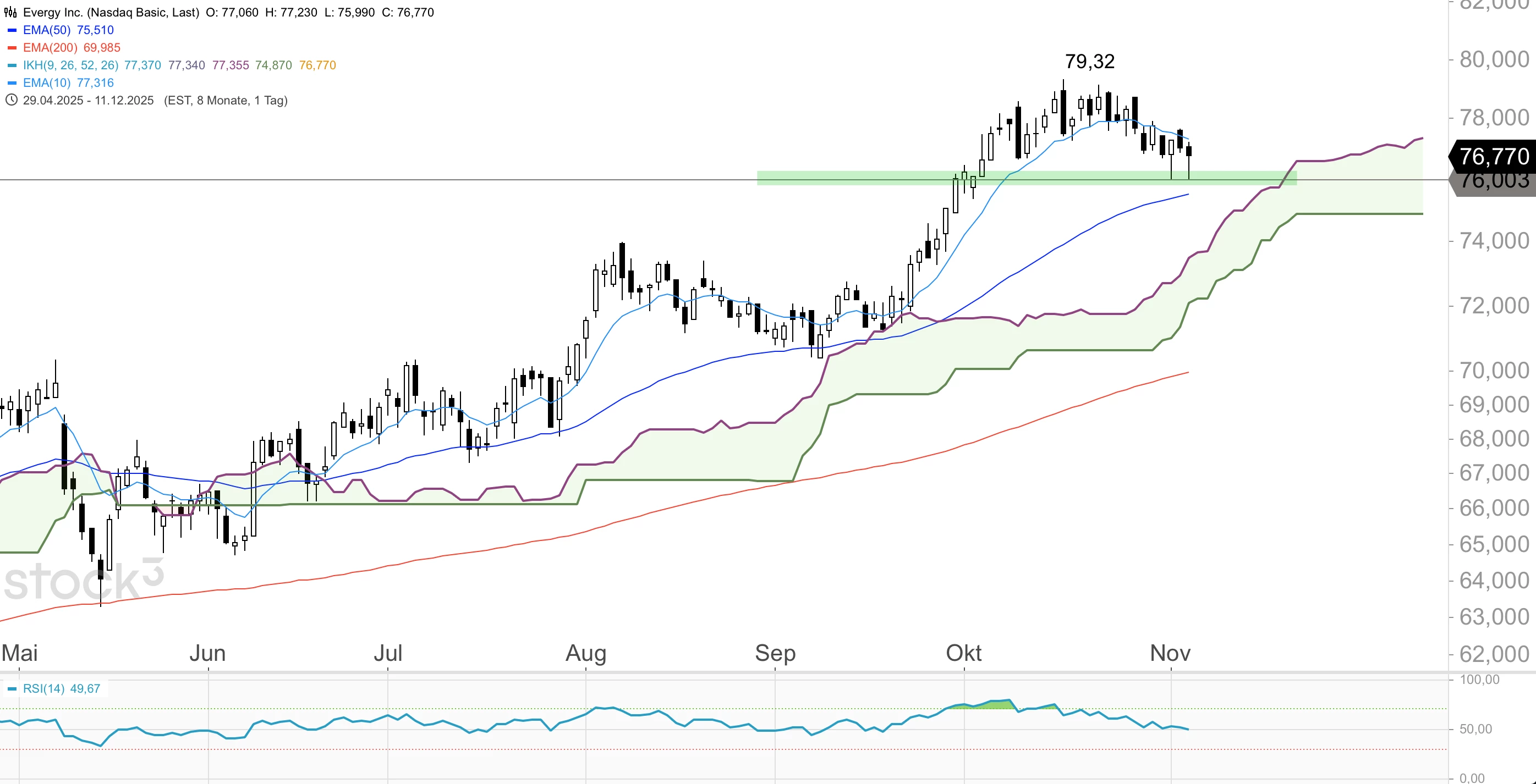 Die Evergy-Aktie befindet sich seit dem Abprall an der Unterstützung um 47,50 USD im Oktober 2023 in einem Aufwärtstrend. Dabei lief das Papier weitgehend über der Ichimoku-Wolke im Tageschart aufwärts, wobei tiefere Korrekturen im Bereich um den 200er-EMA im Tageschart aufgefangen wurden, der aktuell bei 69,98 USD notiert. Das bisherige Verlaufshoch wurde bei 79,32 USD erreicht. Allerdings verläuft die Aktie seit Anfang Oktober über der Unterstützung um 76,00 USD seitwärts und ging am Vortag bei 76,77 USD aus dem Handel.