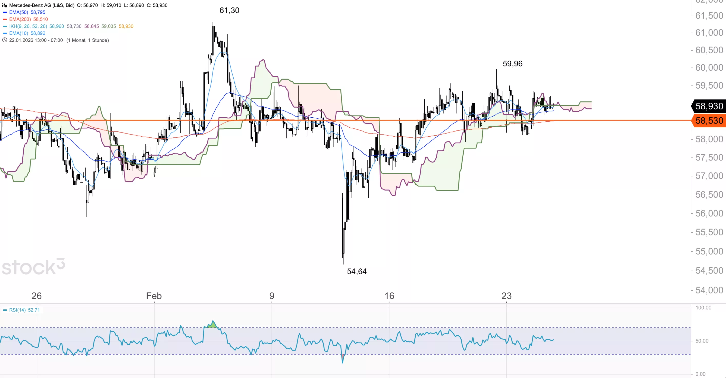 Die Mercedes-Benz-Aktie hat sich nach dem Verlaufstief bei 54,64 EUR Anfang Februar deutlich erholt und notiert nun wieder über dem 200er-EMA bei 58,38 EUR, dem 50er-EMA bei 56,49 EUR und dem 10er-EMA bei 58,54 EUR im Tageschart. Damit hat der Titel die Ichimoku-Wolke nach oben verlassen und nimmt langsam Kurs auf die Widerstandszone um 62,30 EUR. Am Dienstag ging das Papier per Börsenschluss mit einem KGV von 11,04, einem fairen Wert von 66,24 EUR und einem durchschnittlichen Analystenkursziel von 61,80 EUR bei 58,93 EUR aus dem Handel.