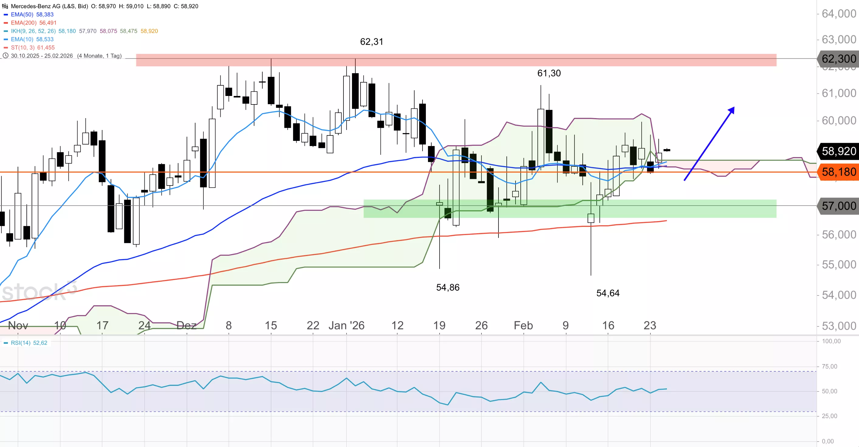 Der Titel zeigt im Tageschart aktuell weiteres Aufwärtspotenzial in Richtung der Widerstandszone um 62,30 EUR. Saisonal tendiert die Aktie im Februar im 15-Jahres-Schnitt noch aufwärts, allerdings dreht die Tendenz ab März ins Negative, was die Aufwärtsdynamik begrenzen könnte. Gelingt dem Titel der nachhaltige Ausbruch über 60,00 EUR, ist die Widerstandszone bei 62,30 EUR die nächste Anlaufmarke. Auf der Unterseite bietet der Bereich um 58,18 EUR erste Unterstützung, darunter stellt die Zone um 57,00 EUR mit dem 200er-EMA bei 56,50 EUR einen wichtigen Auffangbereich dar.