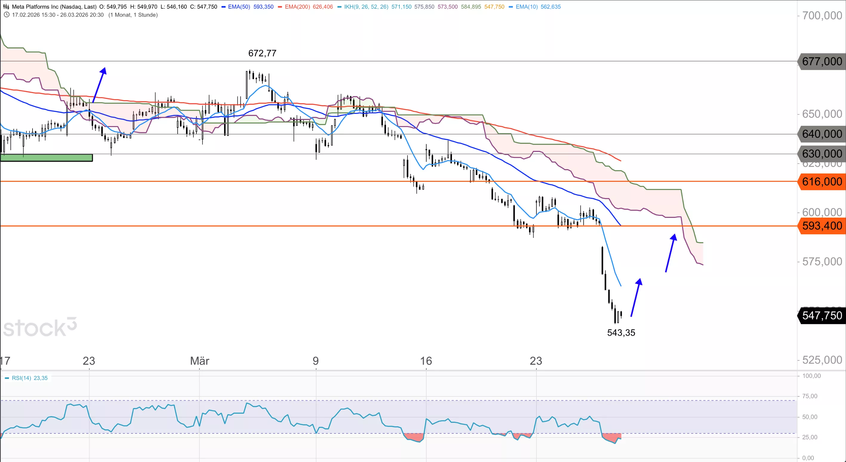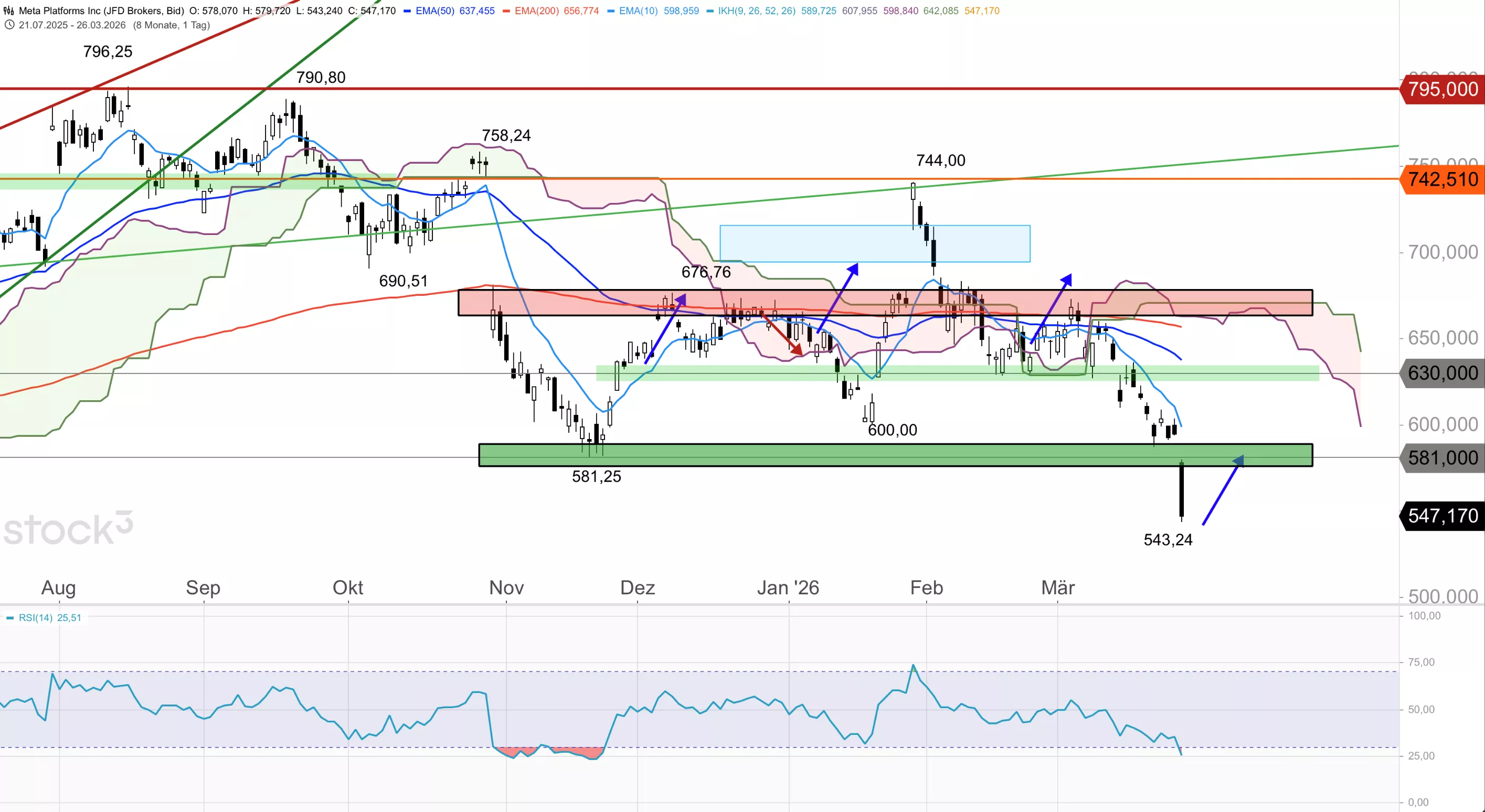 Die Meta-Aktie brach am Vortag um knapp 8 % ein und schloss bei 547,17 USD, womit der Kurs weit unter dem 10er-EMA (598,96), dem 50er-EMA (637,46) und dem 200er-EMA (656,77) sowie unterhalb der Ichimoku-Wolke notiert. Im Stundenchart verläuft das Papier ebenfalls unter allen gleitenden Durchschnitten, wobei der RSI(14) mit 23,35 eine extrem überverkaufte Lage signalisiert. Auch im Tageschart liegt der RSI(14) mit 25,51 tief im überverkauften Bereich. Per Börsenschluss ging das Papier mit einem KGV von 18,39 und einem Analystenkursziel von 860,47 USD aus dem Handel.