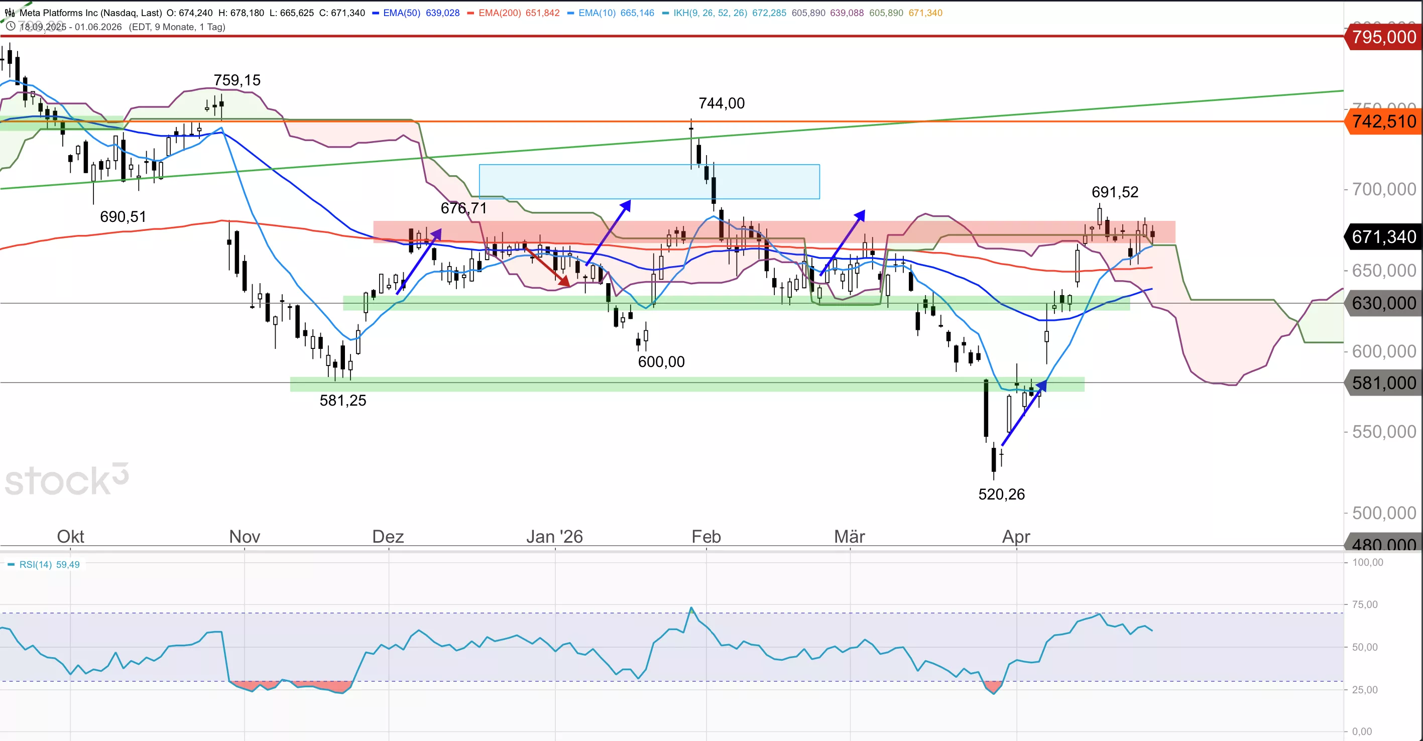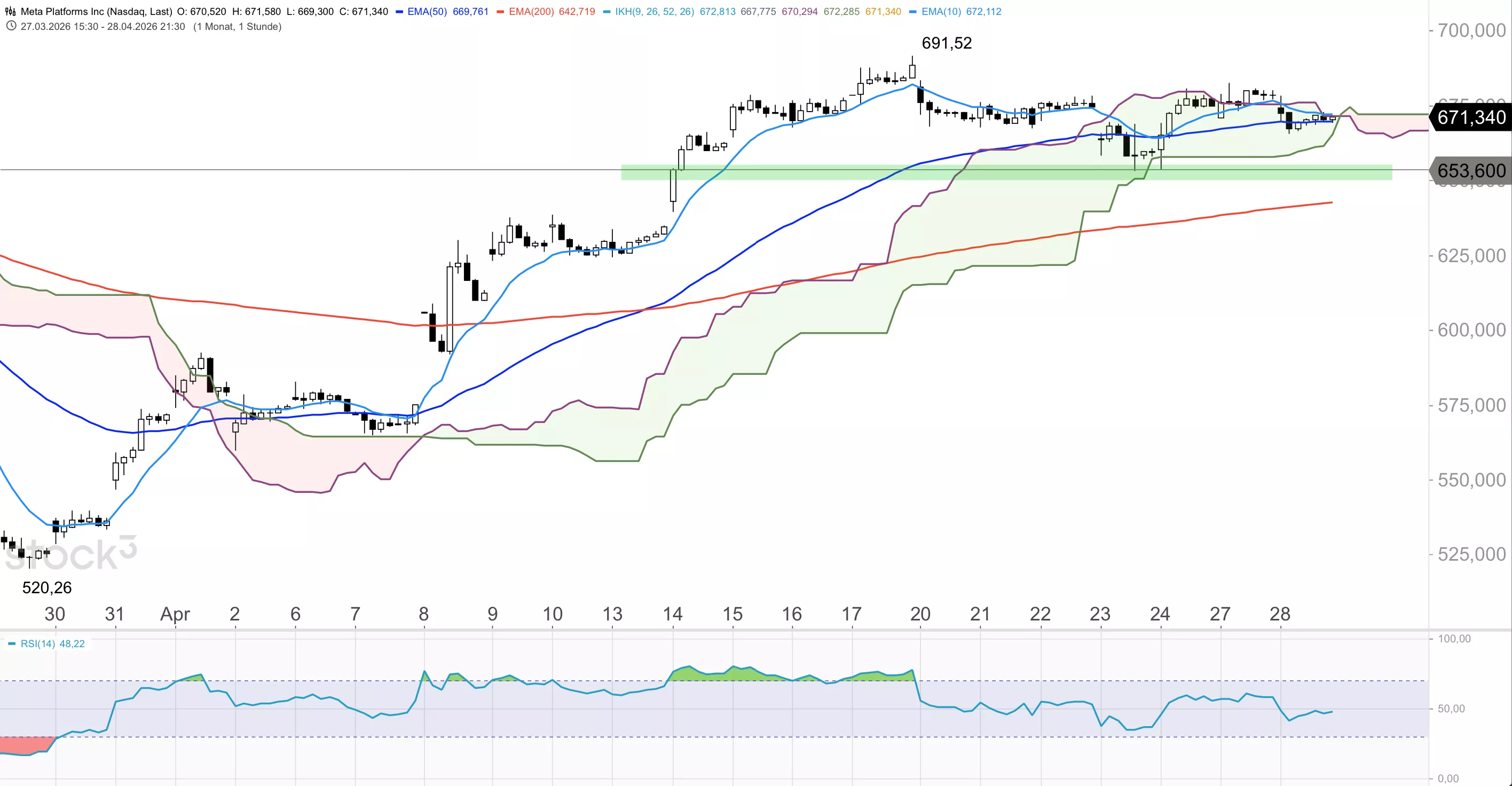 Die Meta-Aktie schloss am Vortag bei 671,34 USD und notiert damit oberhalb des 10er-EMA bei 665,14 USD, des 50er-EMA bei 639,02 USD und des 200er-EMA bei 651,84 USD, also über allen drei wichtigen EMAs, was sehr bullish zu werten ist. Zudem steht das Papier kurz vor dem nachhaltigen Durchbruch aus der Ichimoku-Wolke, deren obere Begrenzung bisher leicht überschritten wurde. In diesem Fall würde ein weiteres langfristiges Stärkesignal generiert werden, zumal die Wolke in Zukunft deutlich abfällt und damit eine solide Unterstützung auf der Unterseite bietet.