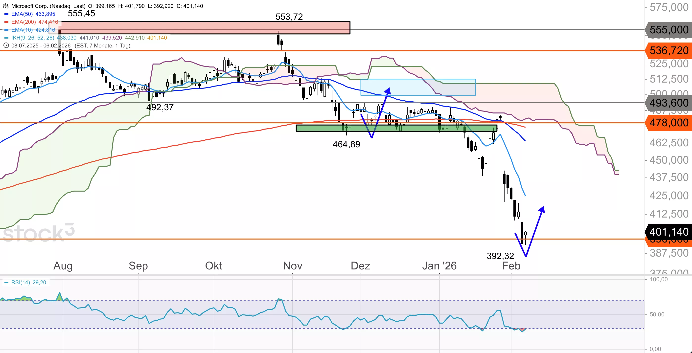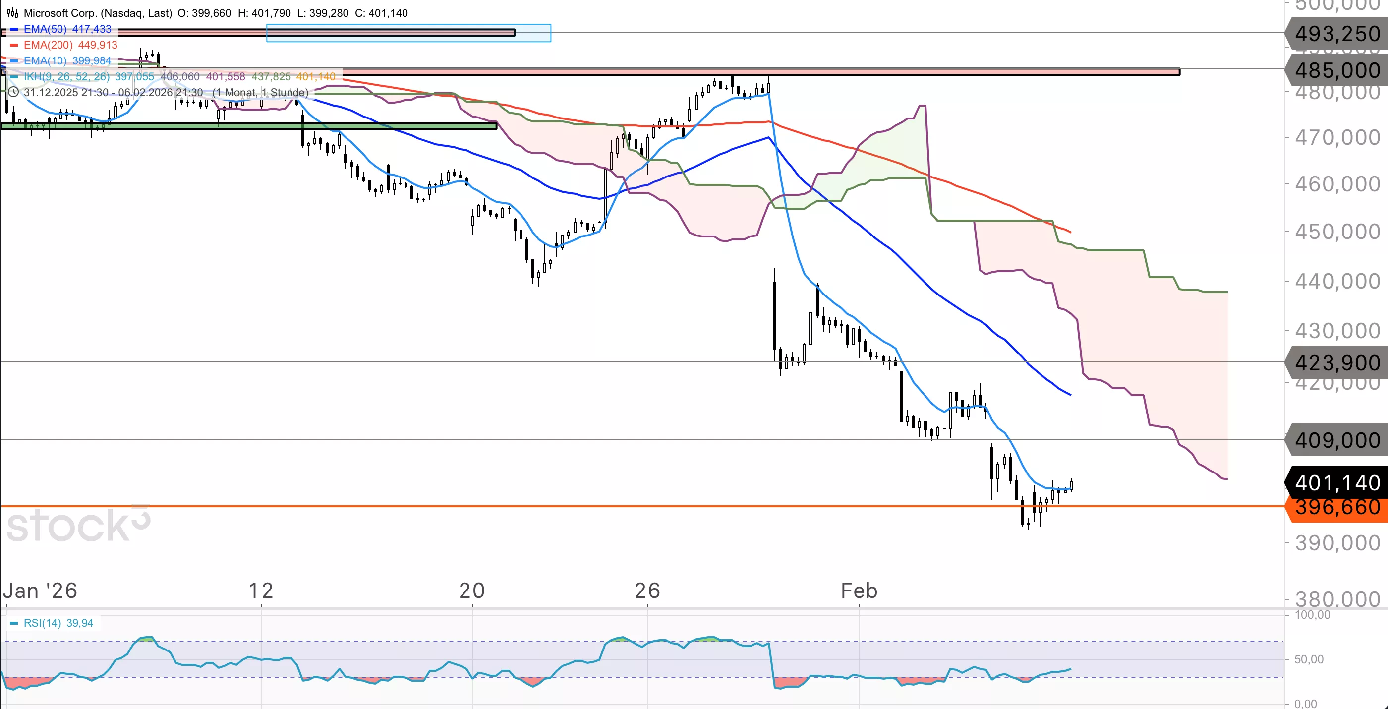 Der Der RSI im Tageschart bei nur 29 signalisiert eine deutlich überverkaufte Lage, die eine weitere Gegenbewegung wahrscheinlich macht. Bei einer andauernden Erholung wäre der 10er-EMA bei 425 USD der erste Anlaufbereich, darüber die frühere Unterstützung um 464 USD, die nun als Widerstand fungiert. Wahrscheinlich gibt die Aktie nach einer kurzen Erholung zum 10er-EMA aber direkt weiter ab. Saisonal zeigt Microsoft laut Daten der vergangenen 15 Jahre im Februar auch eine Schwächephase, erst ab März setzt demnach eine neue Aufwärtsphase ein.