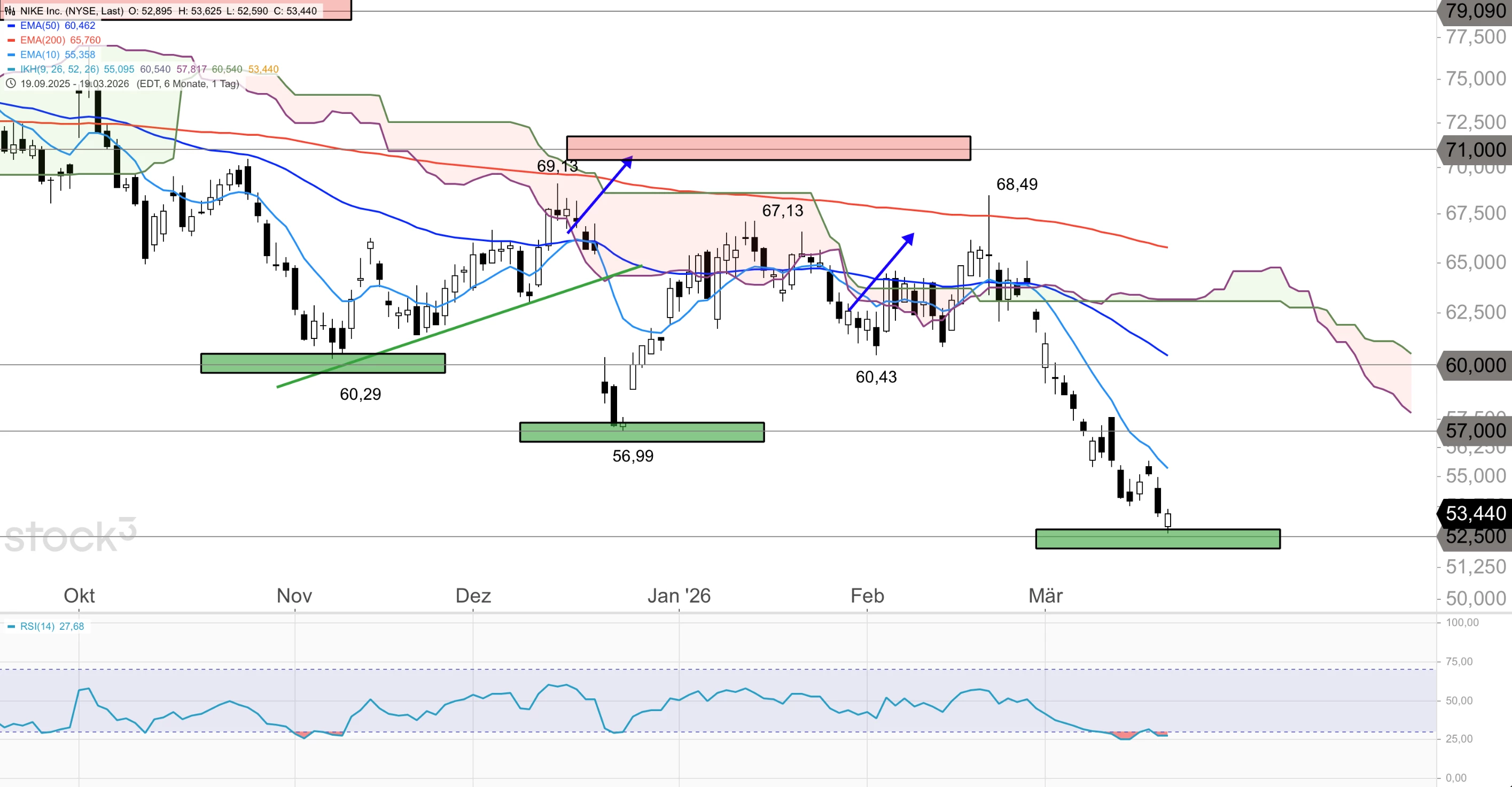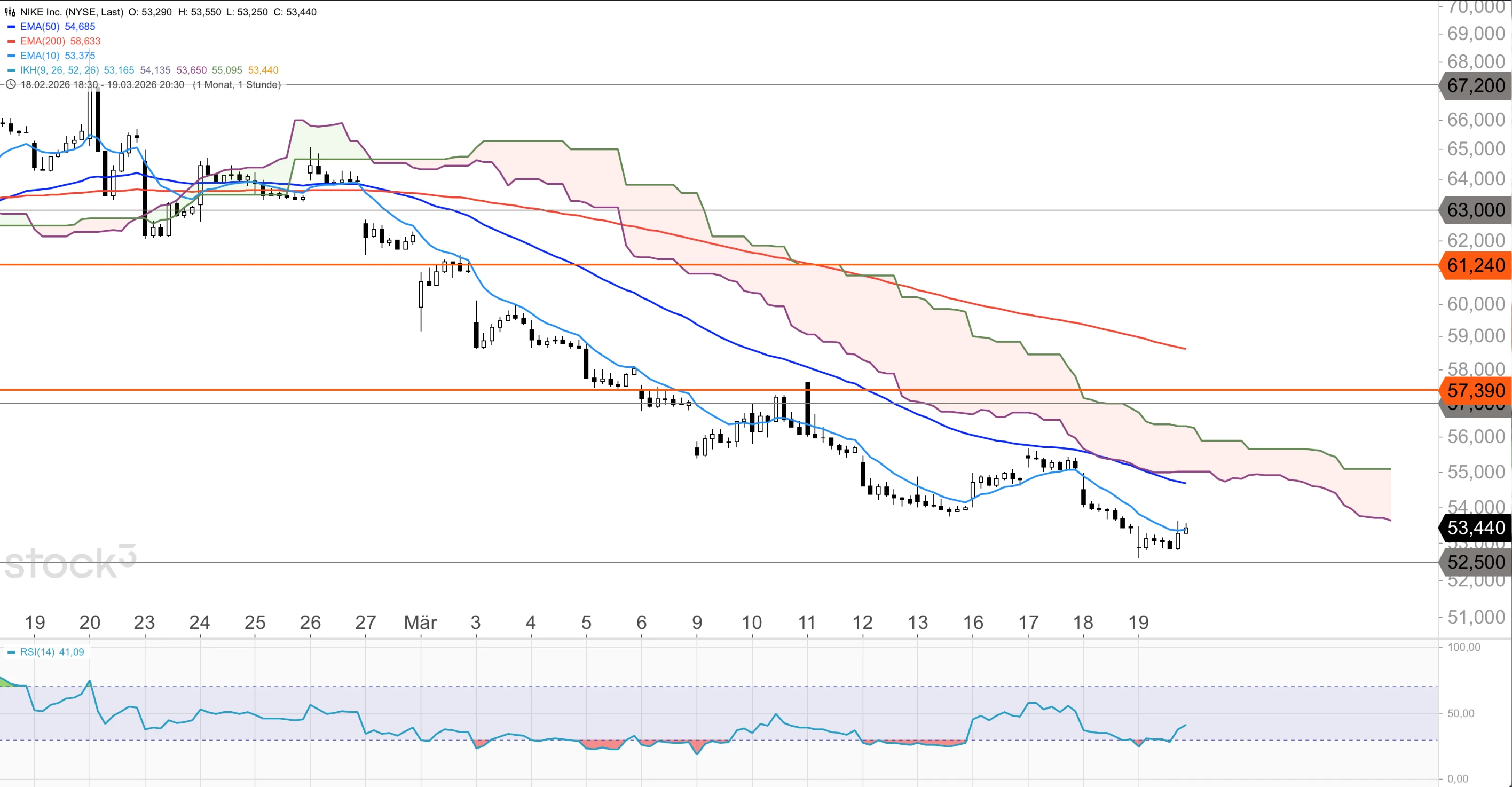 Die Nike-Aktie steht massiv unter Druck. Seit dem Februarhoch bei 68,49 USD hat die Aktie rund 22 % verloren. Der Kurs verläuft aktuell weit unter dem 10er-EMA (55,36), dem 50er-EMA (60,46) und dem 200er-EMA (65,76) im Tageschart sowie unterhalb der Ichimoku-Wolke und deutet damit eher weitere Schwäche an. Der RSI(14) notiert mit 27,68 tief im überverkauften Bereich und signalisiert eine mögliche Gegenbewegung. Per Börsenschluss ging das Papier mit einem KGV von 32,70, einem fairen Wert von 64,10 USD und einem Analystenkursziel von 76,00 USD bei 53,44 USD aus dem Handel.