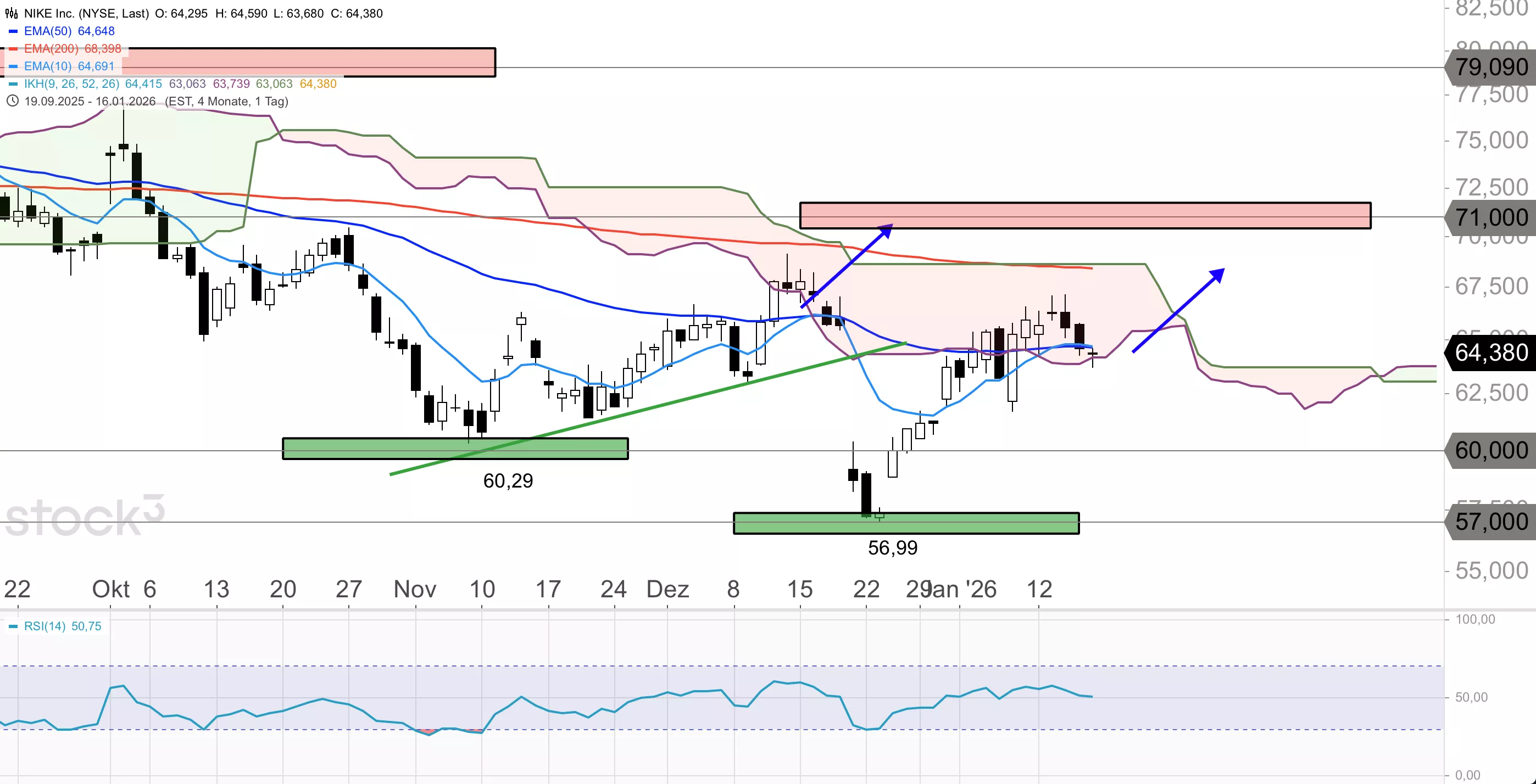 Die Nike-Aktie befindet sich seit August und dem Abprall am massiven Widerstand um 80 USD in einem Abwärtstrend, wobei das bisherige Verlaufstief Ende Dezember bei 56,99 USD markiert wurde. Aktuell verläuft das Papier in einer Erholung, aus der sich ein langfristiger Trendwechsel von Short auf Long entwickeln könnte. Unter kurzen Rücksetzern konnte die Aktie in der laufenden Erholung bis etwa 67,20 USD ansteigen und steht nun kurz vor einem Durchbruch aus der Ichimoku-Wolke im Tageschart nach oben. Am Vortag ging der Titel bei 64,38 USD aus dem Handel.