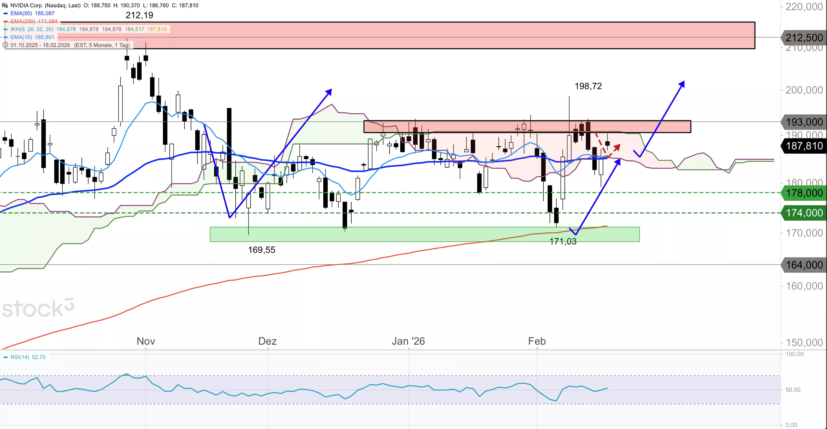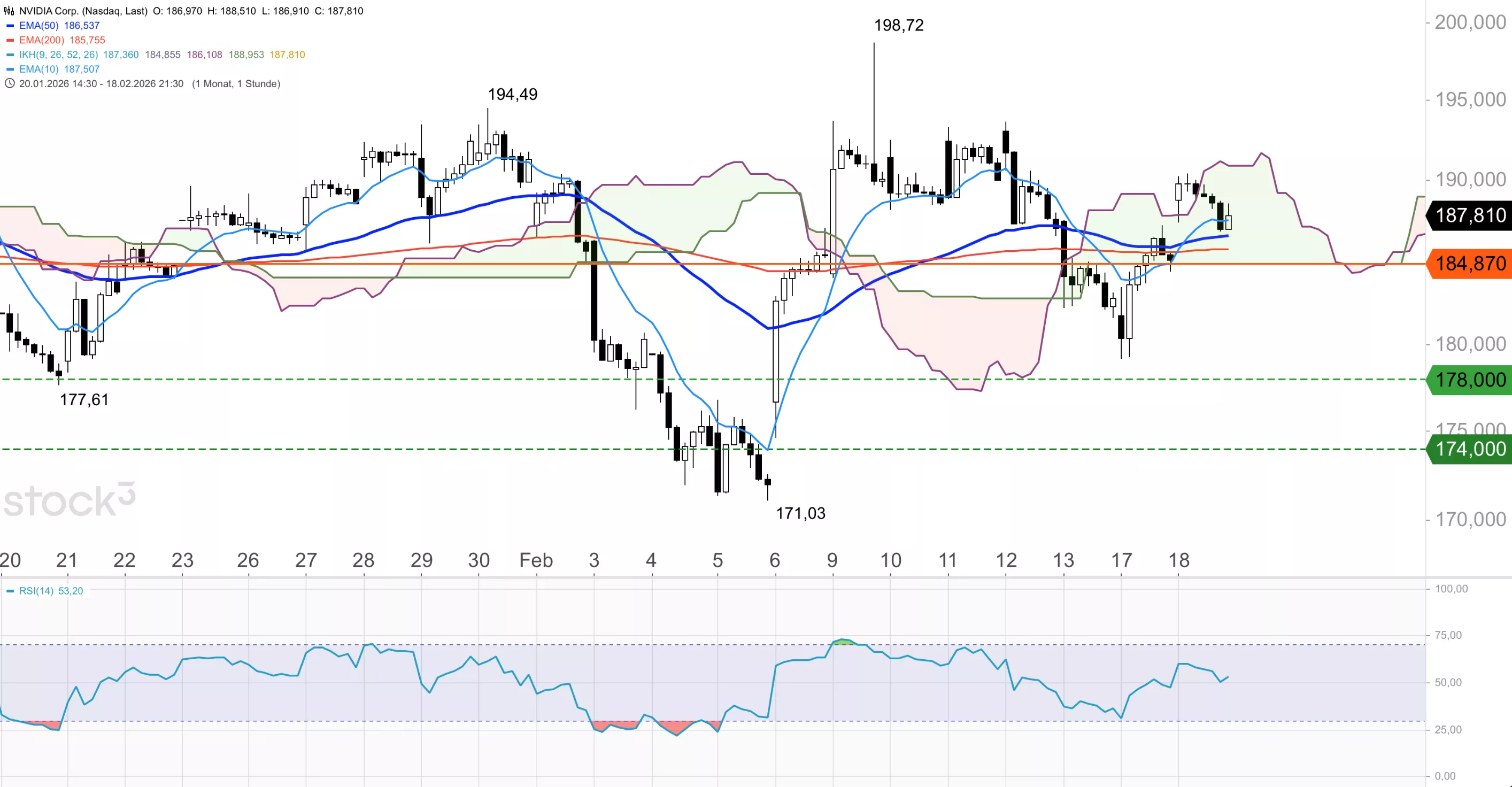 Die Nvidia-Aktie notiert oberhalb des 50er-EMA bei 185,09 USD, der RSI liegt bei 52,7 und bietet noch Spielraum nach oben. Saisonal tendiert die Aktie im Februar im 15-Jahres-Schnitt eher aufwärts, zumal am 25. Februar die Quartalszahlen anstehen und die Erwartungshaltung hoch ist. Kann der Titel die Widerstandszone um 193,00 USD überwinden, ist das Februar-Hoch bei 198,72 USD die nächste Anlaufmarke. Auf der Unterseite bietet der 50er-EMA bei 185,09 USD Halt, darunter droht aber ein Rückfall in Richtung 178,00 und 174,00 USD.