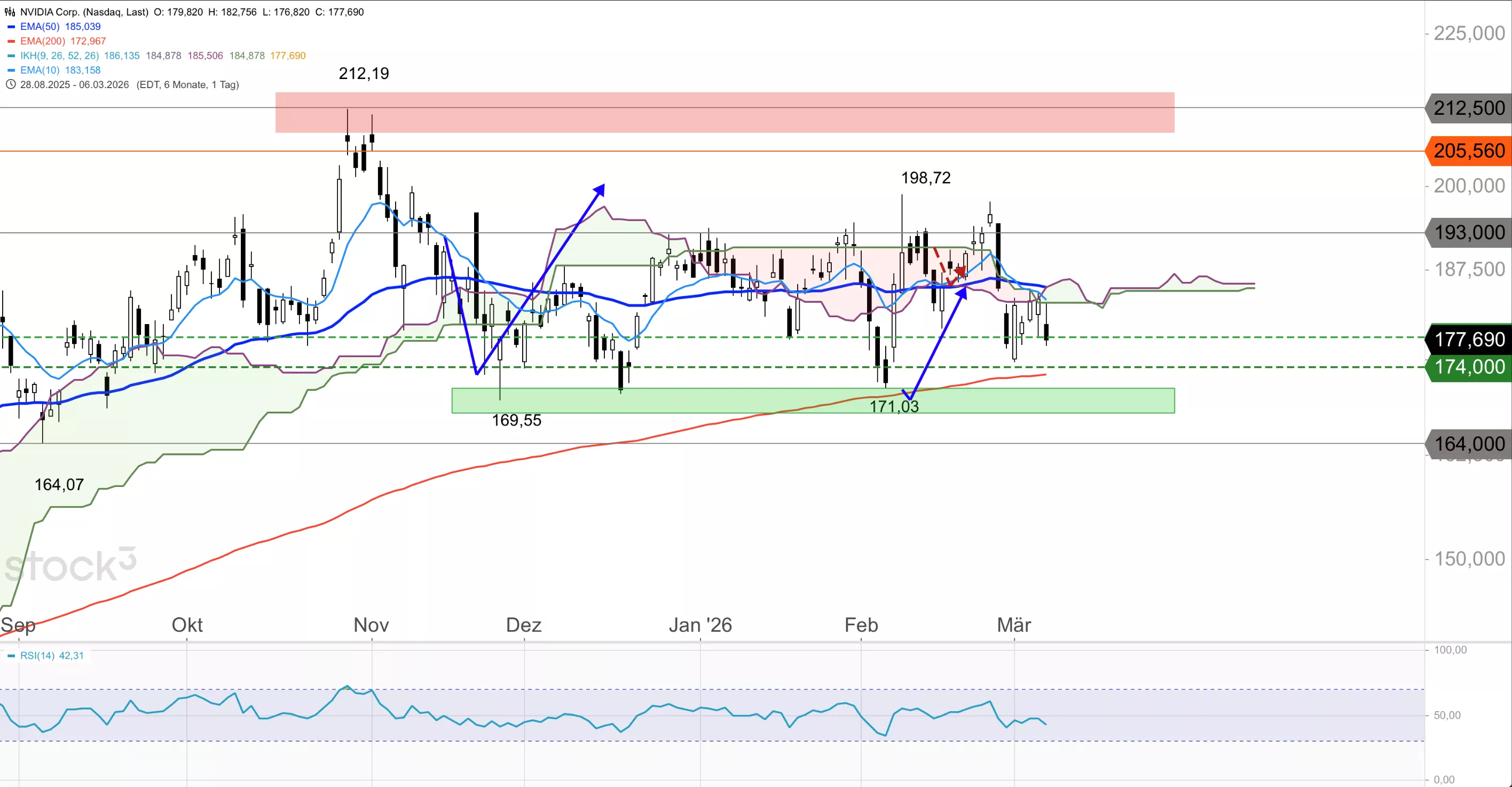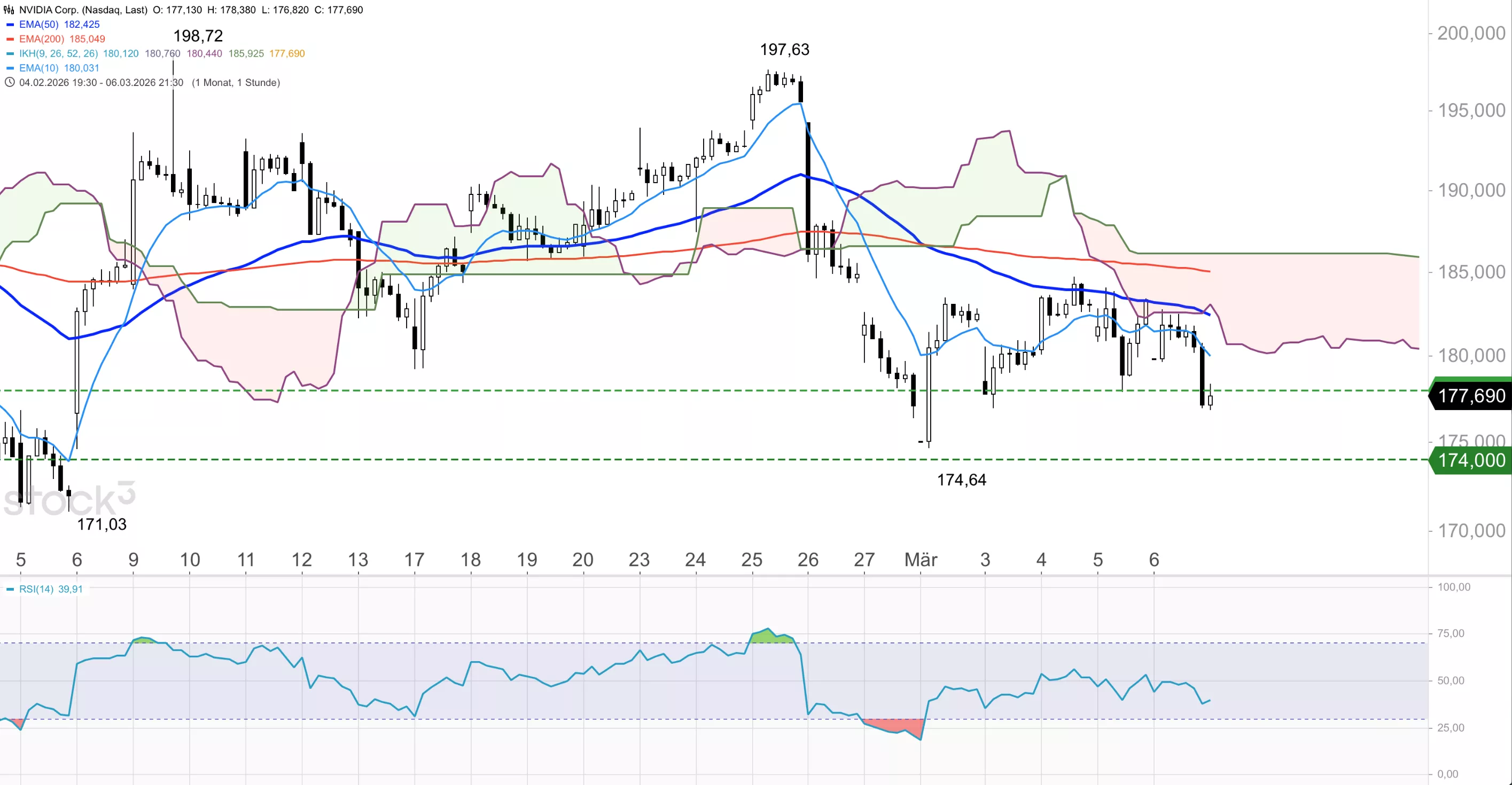 Die Nvidia-Aktie notiert im Stundenchart unter dem 10er-EMA bei 180,03 USD, dem 50er-EMA bei 182,43 USD und dem 200er-EMA bei 185,05 USD sowie unter der Ichimoku-Wolke. Der RSI im Stundenchart liegt bei 39,9 und nähert sich der überverkauften Zone. Saisonal tendiert die Aktie im März im 15-Jahres-Schnitt zwar aufwärts, doch solange der Titel unter dem 50er-EMA im Tageschart verbleibt, sind eher weiter fallende Kurse zu erwarten. Unter 174,00 USD droht ein Test des Februar-Tiefs bei 171,03 USD. Am 27. Mai stehen die nächsten Quartalszahlen an.
