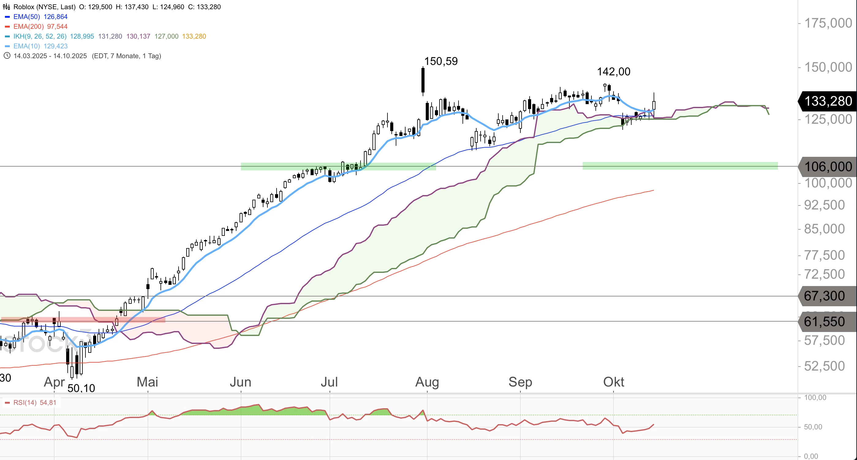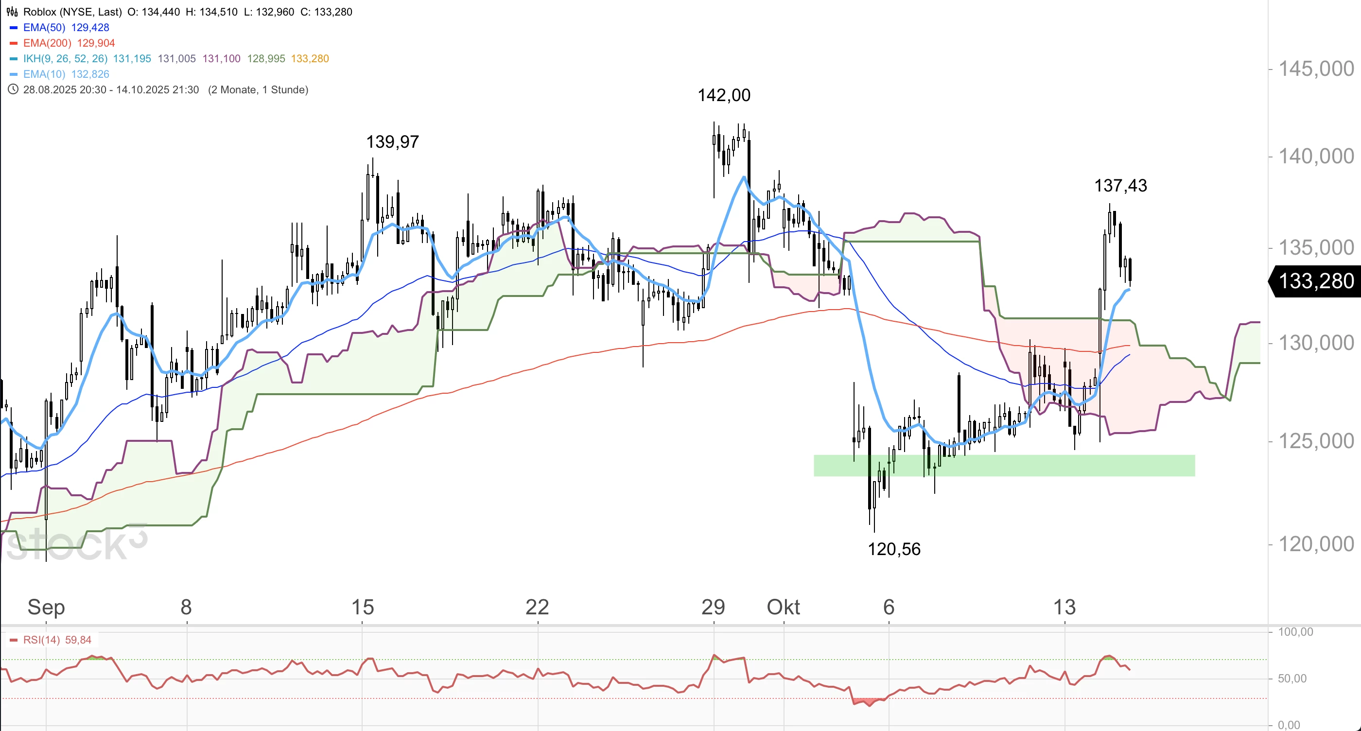 Die Roblox-Aktie befindet sich in einem monatelangen Aufwärtstrend, ist aber seit dem Verlaufshoch bei 150,59 USD Ende Juli unter Druck geraten. Das Papier befindet sich seitdem in einer Seitwärtsbewegung beziehungsweise leicht steigenden Bewegung, kann sich aber bisher weiterhin über der Ichimoku-Wolke im Tageschart halten. In den Vortagen konnte sich das Papier nach einer erneuten Abwärtsbewegung am 50er-EMA fangen und in der Folge wieder ansteigen. Aktuell zeigt sich die Roblox-Aktie etwas über dem 10er-EMA, der bei 129,42 USD notiert.