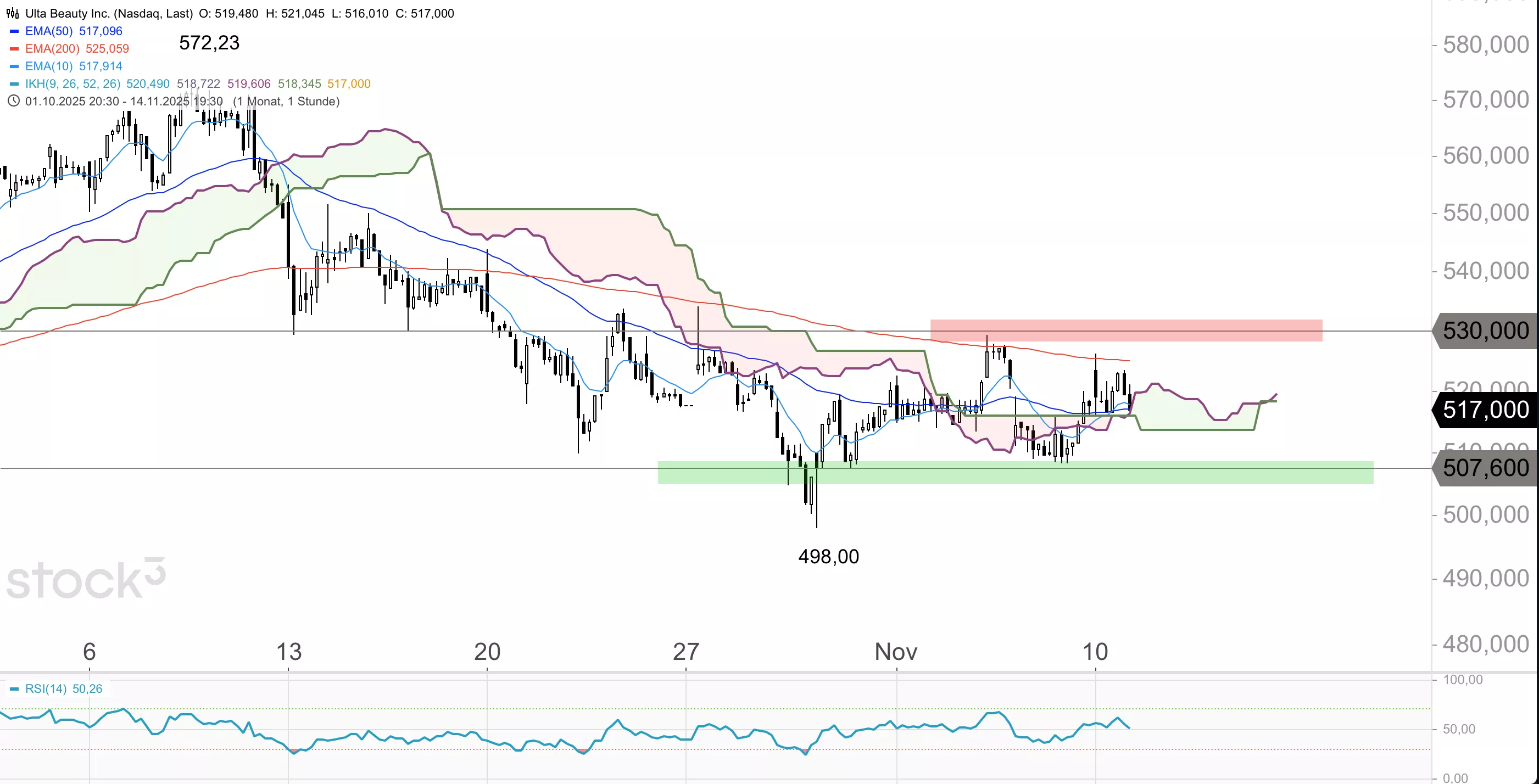 Die Ulta-Beauty-Aktie befindet sich seit dem Verlaufshoch bei 572,23 USD vom 08. Oktober in einem Abwärtstrend. Dabei wurde ein erstes Warnsignal mit einem Kursrückgang unter den 10er-EMA generiert, der in der Folge auch nicht mehr nachhaltig zurückerobert werden konnte. Im weiteren Kursverlauf sackte das Papier auch unter 50er-EMA und die Ichimoku-Wolke im Tageschart ab und erreichte ein bisheriges Verlaufstief bei 498,00 USD. In der Gegenbewegung erreichte die Aktie den 50er-EMA und die untere Begrenzung der Ichimoku-Wolke, sackte hier aber wieder nach unten ab.