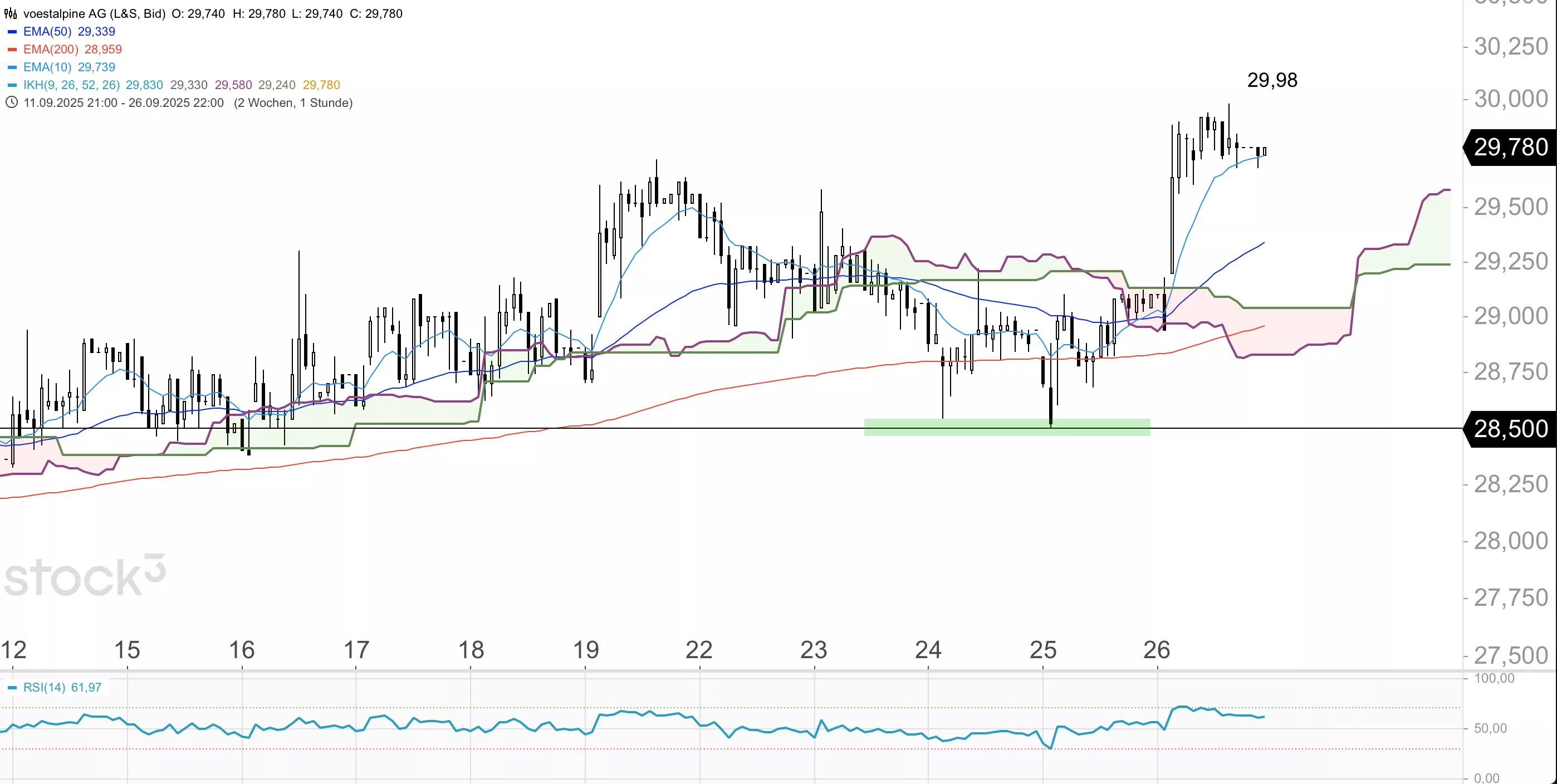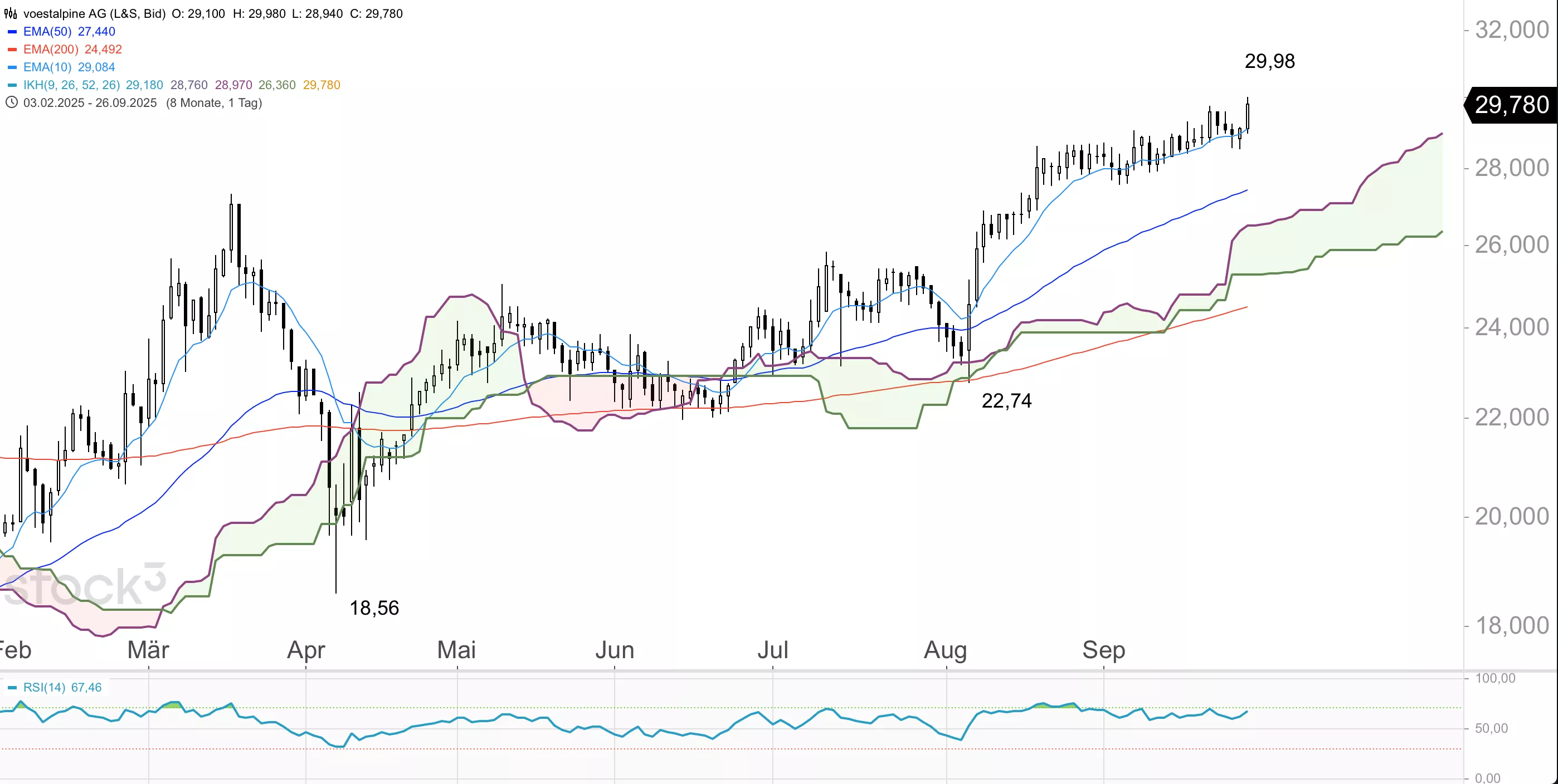 Die voestalpine-Aktie befindet sich in einem langfristigen Aufwärtstrend und konnte sogar im Trump-Crash die Ichimoku-Wolke im Tageschart weitgehend verteidigen. Seit der jüngsten Korrektur Anfang August mit dem Verlaufstief bei 22,74 EUR startete das Papier eine weitere Aufwärtsbewegung, wobei am Freitag im Tageshoch mit 29,98 EUR fast die Marke von 30 EUR erreicht wurde. Die Aktie ging per Börsenschluss bei 29,76 EUR aus dem Handel. Zudem mit einer langen bullischen Tageskerze, die weitere Stärke andeutet.