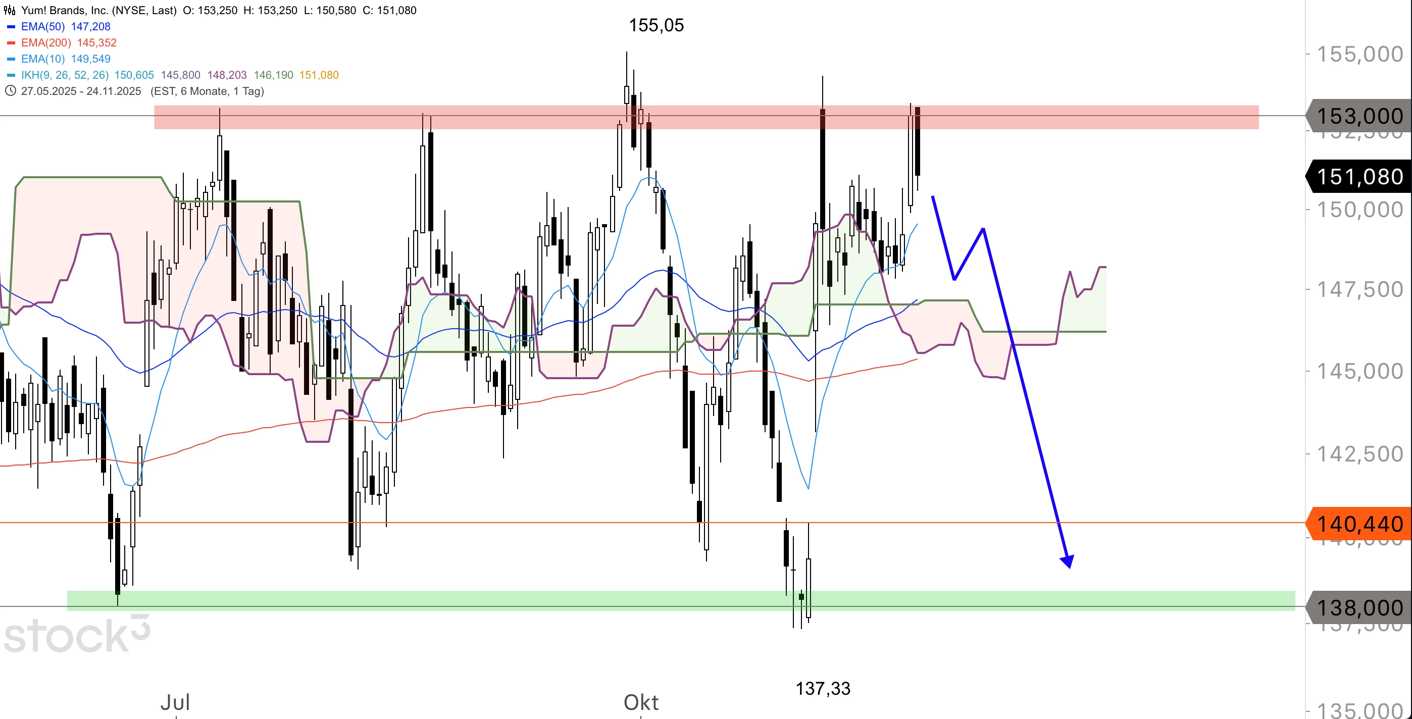 Die Yum!-Brands-Aktie bewegt sich seit mehreren Monaten in einer ausgedehnten Seitwärtsbewegung in einem Seitwärtskanal zwischen 138 USD auf der Unterseite und 153,00 USD auf der Oberseite. Aktuell ist das Yum!-Brands-Papier erneut an der oberen Begrenzung um 153 USD angekommen und hier am Vortag nach unten abgeprallt. Die Aktie ging bei 151,08 USD aus dem Handel, zudem mit einer langen schwarzen Tageskerze. Die Ichimoku-Wolke ist weiterhin flach, tendiert seitwärts und zeigt damit kaum Trenddynamik an.