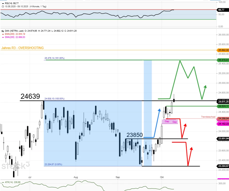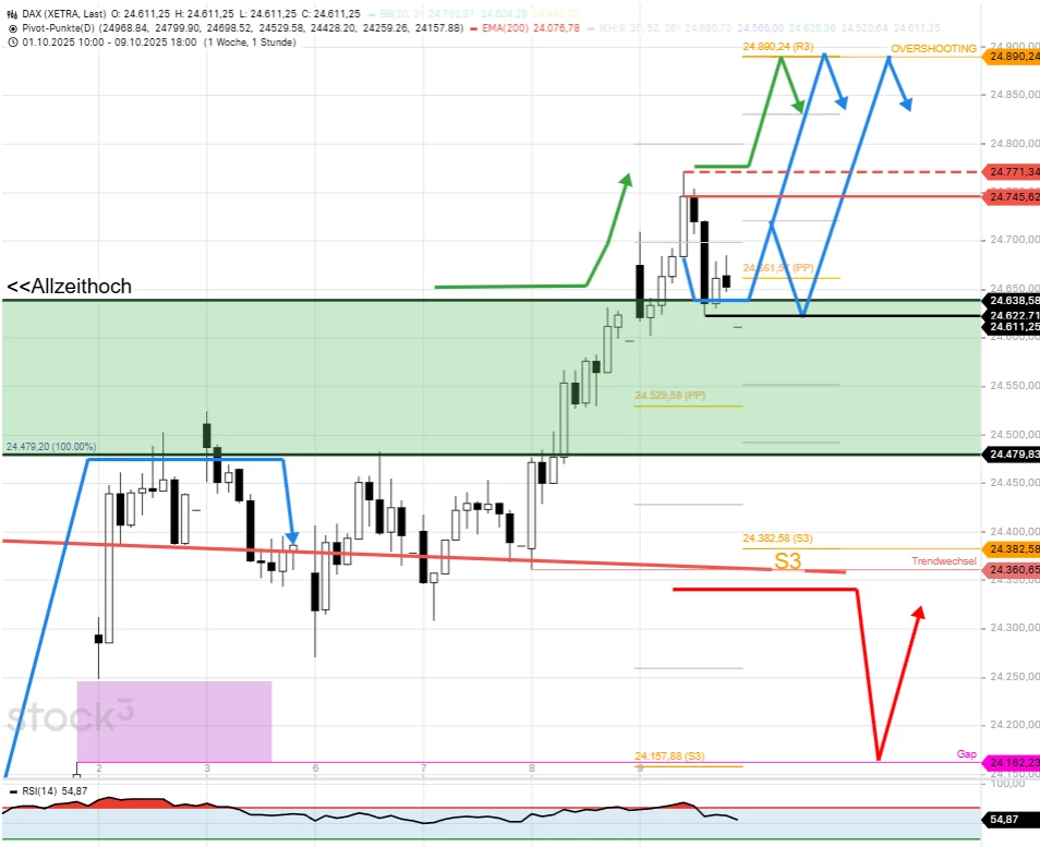 2. Anlauf am DAX Allzeithoch 24.639! Zweiter Versuch, die alten Hochs bei 24639 deutlicher hinter sich zu lassen als gestern. Geht so was mit Ansage? Ausbruchsansagen dieser Kategorie verzerren die Erwartungshaltung derart stark, so dass dies Akteure auf den Plan ruft, die es kaputt machen können bis Keiner mehr dran glaubt. Da ich aber an das markante SAP Tief seit 210 EUR glaube, leite ich ab, dass es auch der DAX schaffen müsste, die alten Hochs bald hinter sich zu lassen. Es gilt ohnehin, dass ein Ausbruchssignal nur dann Wirksamkeit erlangt, wenn der DAX per Tagesschluss deutlich über dem alten den Tag beschließt (im XETRA DAX Haupthandel). Dann würde es heißen: Schließt der DAX per Tagesschluss über 24.639, dann schaltet sich das Kursziel 25.476 frei, als "GOLDEN MEILENSTEIN"-Ziel. Intra day DAX Unterstützungen sind 24.639/24.622 sowie 24.480 und 24.380/24.360. Intra day DAX Widerstände bzw. Ziele stellen heute 24.745/24.770 und 24.890 (R3) dar.