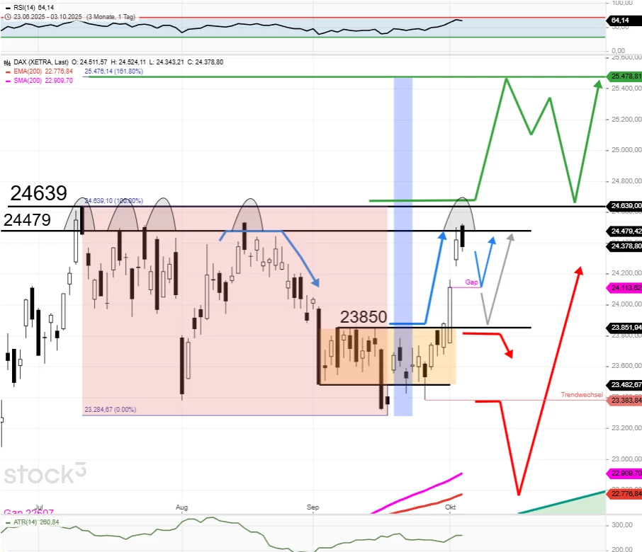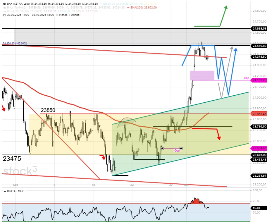 Der DAX meldete sich letzte Woche zurück und erwachte aus seinem Sommerschlaf. Nach dem der Index die Signalmarke 23.850 überbot, preschte der Handel innerhalb von 2 Tagen zum Zwischenkursziel 24.479. (Freitag war dann ein Nonsens-Tag).