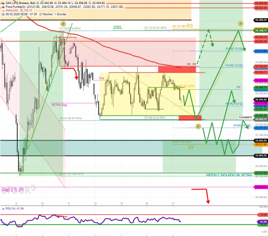 Insbesondere Verlaufstiefs bei 23.250 wären noch mal eine Maßnahme, um Schwung zu holen für den logischen Versuch, bald ein zweites Mal Richtung 24.100 zu ziehen. DAX-Widerstand 1 des Tages auf Basis "indikativer Pre-Handel" ist der Bereich 23.540/23.560. DAX-Widerstand 2 des Tages auf Basis "indikativer Pre-Handel" ist der Bereich 23.700/23.750. Hauptunterstützung des Tages ist wie gestern der Bereich 23.300/23.250. Es gibt auch eine (hier gelb markierte) Range zwischen 23.300 und 23.700. Der DAX pendelt hier gern hin und her. Bricht der DAX mit einer langen weißen Momentum-Stundenkerze über 23.700/23.750 aus, ist die Route zu 24.100 bestätigt.