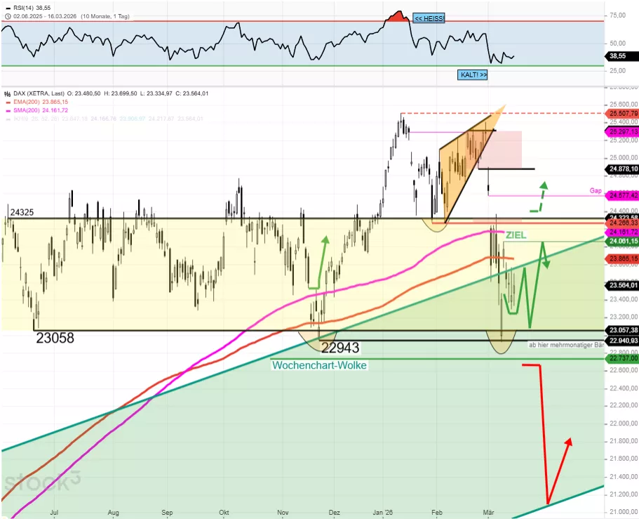 BASISANNAHME: Dem DAX ist zu unterstellen, dass er diese Woche über dem Pre-Tief der Vorwoche, also über 22.705, verbleibt. Das traf gestern zu.