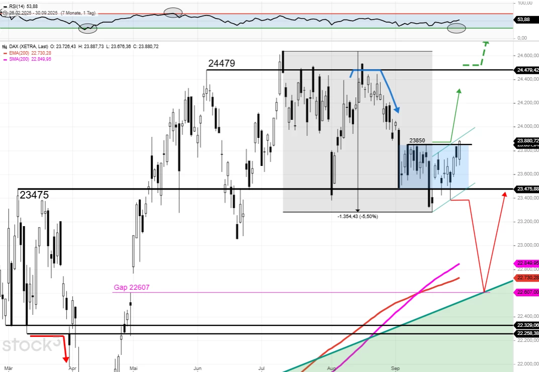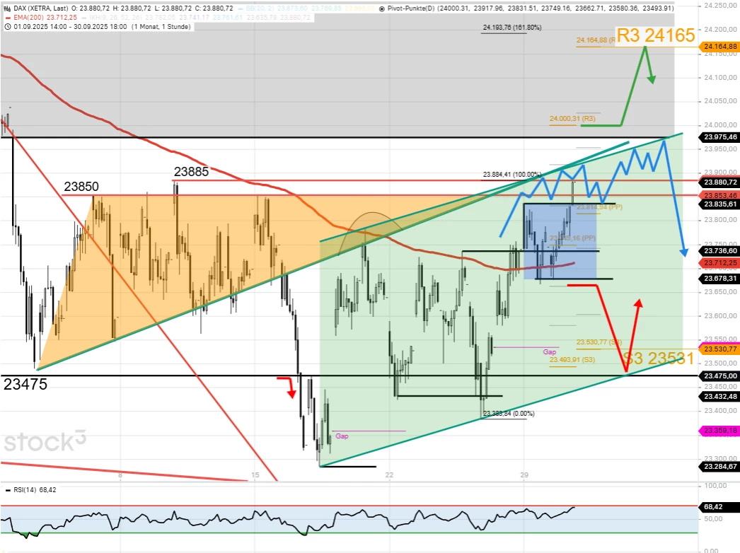 Heute werden wir im Tagesverlauf zu prüfen haben, ob sich der DAX über der Hürde 23.850 etablieren kann und den nächsten Widerstand bei 23.975 in Angriff nimmt oder ob nach einem leichten Überschuss zum Quartalsschluss tatsächlich an der tagelang propagierten Entscheidungsmarke Schluss ist und eine Talfahrt Richtung 23.475 beginnt. 1) Über dem gestrigen Tief 23.675/23.670 liegt im DAX ein Aufwärtstrend vor. Das heißt: Jeder beliebige DAX Rücksetzer der sich über 23.675/23.670 abspielt besitzt die Eigenschaft, dass man ihn kontern und in neue DAX Wochenhochs verwandeln kann. 2) Eine erste nennenswerte kleine DAX Unterstützung stellt 23.775 (horizontal) dar. Auch 23.700 zählt noch zu den guten Unterstützungen (EMA200/h1). 3) DAX Widerstände stellen sich durch die Lage der aktuellen neuen Aufwärtstrendkanalbegrenzung bei ~23.915 (stündlich etwas steigend) und bei 23.975 (horizontal) in den Weg. 4) Über 24.000 könnte der DAX heute bis 24.165/24.190 und abends sogar bis 24.293 steigen. 5) Unter 23.670 würde es Verkaufssignale geben, was den DAX bis 23.475/23.450 fallen ließe