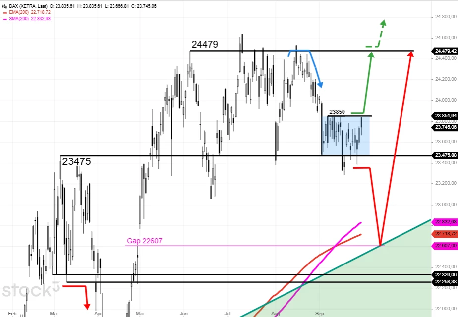 Der DAX bewegt sich in der Kernzone zwischen 23.850 und 23.475. Kleine DAX Unterstützungen stellen am Vormittag die DAX Marken 23.730, 23.705 und 23.675/23.665 dar. Eine große DAX Unterstützung des Tages ist der Bereich 23.493 (S3)/23.475 . DAX Widerstände sind weiterhin zu finden bei 23.850 und 23.975/24.000. Über 24.000 steigt der DAX heute wegen der Lage des Tages-Pivot R3 bei exakt 24.000 kaum. Über 23.850 (Tagesschluss) verbessert sich das Chartbild und ermöglicht DAX Indexanstieg zu 23.975 und über 23.975 auch zu 24.480. Unter 23.475 (Tagesschluss) bestehen Abwärtsrisiken bis 22.850/22.610, wo vor allem die beiden 200-Tages-Linien (EMA+SMA) kreuzen.