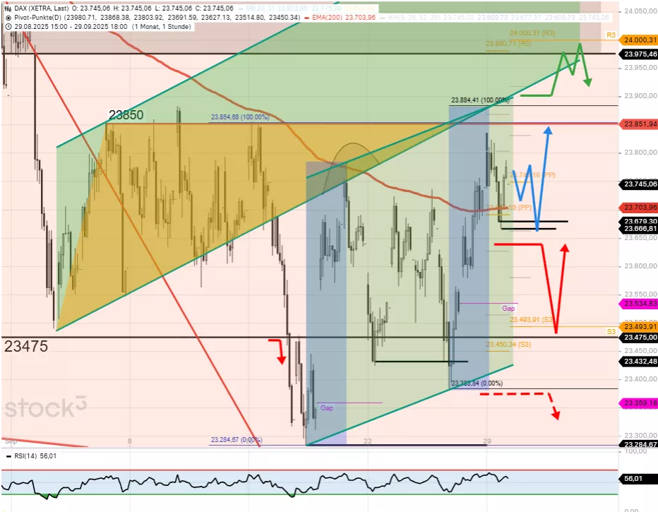 Der DAX bewegt sich in der Kernzone zwischen 23.850 und 23.475. Kleine DAX Unterstützungen stellen am Vormittag die DAX Marken 23.730, 23.705 und 23.675/23.665 dar. Eine große DAX Unterstützung des Tages ist der Bereich 23.493 (S3)/23.475 . DAX Widerstände sind weiterhin zu finden bei 23.850 und 23.975/24.000. Über 24.000 steigt der DAX heute wegen der Lage des Tages-Pivot R3 bei exakt 24.000 kaum. Über 23.850 (Tagesschluss) verbessert sich das Chartbild und ermöglicht DAX Indexanstieg zu 23.975 und über 23.975 auch zu 24.480. Unter 23.475 (Tagesschluss) bestehen Abwärtsrisiken bis 22.850/22.610, wo vor allem die beiden 200-Tages-Linien (EMA+SMA) kreuzen.
