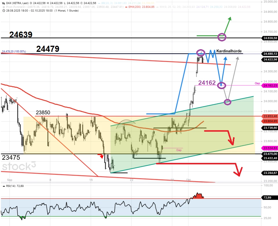 Durch den Anstieg über 23.850 hatte sich das Kursziel 24.480 freigeschaltet. Das Kursziel 24.480 wurde in kürzester Zeit erreicht, denn der DAX stieg in nur 2 Tagen von 23.850 auf 24.480.