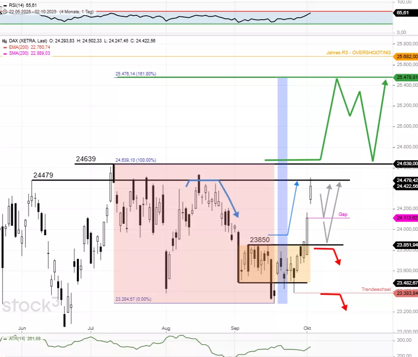 Durch den Anstieg über 23.850 hatte sich das Kursziel 24.480 freigeschaltet. Das Kursziel 24.480 wurde in kürzester Zeit erreicht, denn der DAX stieg in nur 2 Tagen von 23.850 auf 24.480.