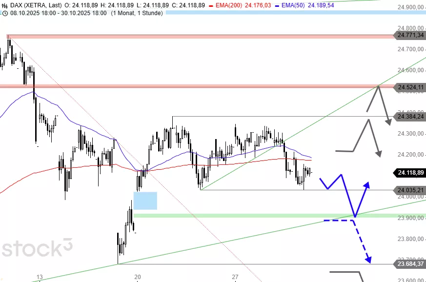 Im gestrigen Handel setzte sich die kurzfristige Abwärtstendenz beim DAX nach einer zunächst bullischen Eröffnung letztlich mit dem erneuten Bruch des Supports bei 24.140 Punkten fort. Die Unterstützung bei 24.035 Punkten wurden im Rahmen der kleinen Verkaufswelle aber verteidigt. Damit bleibt der DAX zunächst noch in der breiten Range der letzten Tage.