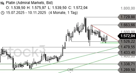 Nach Abschluss des zweiten Rücksetzers an das Gebiet um 1.500 USD könnte heute mit dem Bruch der kurzfristigen Abwärtstrendlinie ein bullischer Konter starten, der Platin bis 1.626 USD antreiben kann. Unter 1.513 USD wäre diese Chance vergeben.