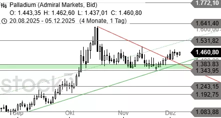 Die Erholung bei Palladium könnte heute neuen Schwung erhalten und über den Widerstand bei 1.475 USD führen. Damit stünde eine Kaufwelle bis 1.531 USD an, die sich darüber bis 1.585 USD ausdehnen kann. Kurse unter 1.410 USD würden jedoch für eine Fortsetzung der Seitwärtsphase sorgen.