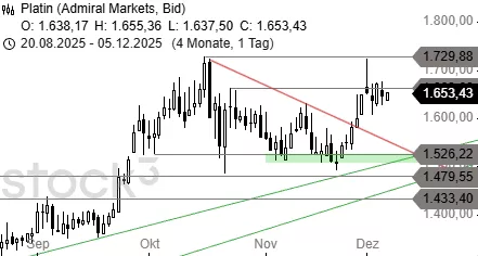 Knapp unterhalb des bereits überschrittenen Widerstands bei 1.663 USD sammeln die Bullen bei Platin aktuell ihre Kräfte und könnten den nächsten Ausbruchsversuch über das Hoch bei 1.729 USD einleiten. Kurse unter 1.600 USD würden dagegen für eine kurze Korrekturphase sprechen.