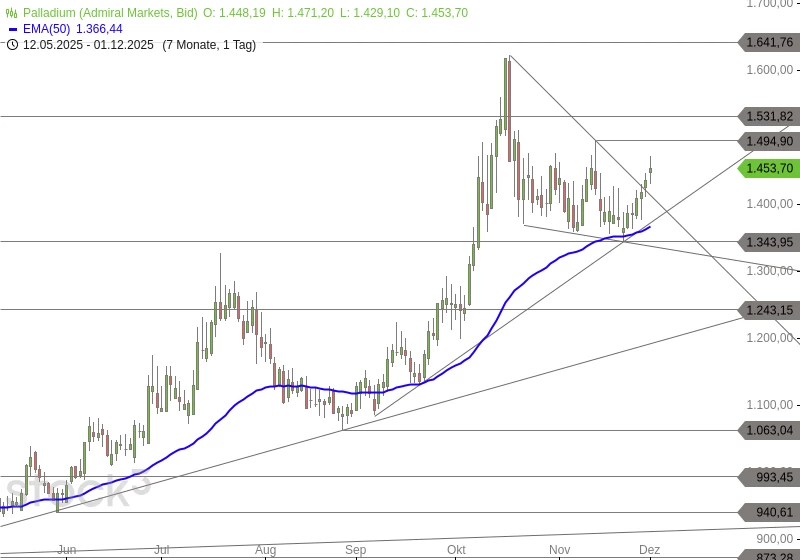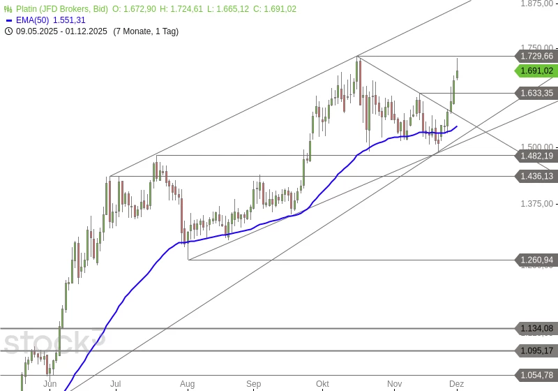 Innerhalb des übergeordneten Aufwärtstrendkanals konnte sich Platin in der Vorwoche nach oben lösen und den kurzfristigen Abwärtstrend überwinden. Die Aufwärtsbewegung beschleunigte sich zum Wochenschluss und führte die Notierungen bis an den Widerstand bei 1.730 USD. Ein Rücksetzer von dieser Marke wäre jederzeit möglich. Rücksetzer unter 1.633 USD sollten aus bullischer Sicht vermieden werden, da sonst eine zweite Korrekturwelle drohen könnte.