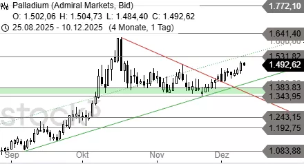 Palladium hat den Widerstand bei 1.475 USD durchbrochen und könnte die Erholung jetzt direkt bis 1.531 USD sowie darüber bis 1.585 USD fortsetzen. Der Anstieg der letzten Tage wäre erst bei Kursen unter 1.426 USD gekontert.