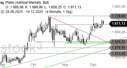 Platin stieg gestern über die Hürde bei 1.663 USD und dürfte damit in Kürze das Rallyhoch bei 1.729 USD angreifen. Darüber könnte der Aufwärtstrend bis 1.815 USD fortgeführt werden. Erst ein Abverkauf unter 1.600 USD beendet diese Ausbruchsbewegung.