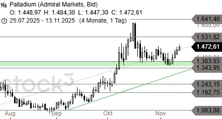Palladium versucht aktuell über den Widerstand bei 1.475 USD in Richtung 1.531 USD auszubrechen. Diese Anstiegschance wäre erst bei Kursen unter 1.383 USD vergeben.