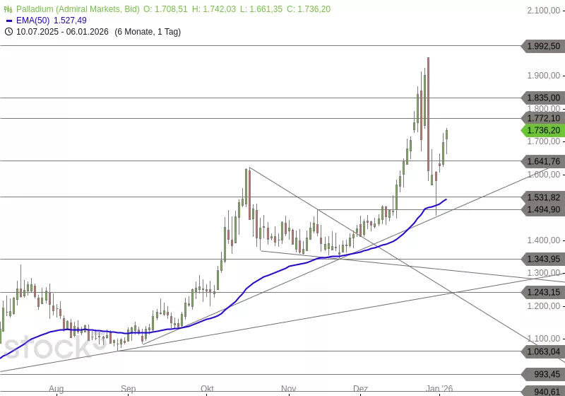 Palladium rutschte nach einem zuvor sehr dynamischen Anstieg bis knapp unter die Marke von 2.000 USD deutlich zurück. Der Rücksetzer wurde im Bereich der Unterstützungszone um 1.495 USD sowie am mittelfristigen Aufwärtstrend der vergangenen Monate aufgefangen. Ausgehend von dieser Zone konnten sich die Notierungen zuletzt wieder nach oben absetzen.