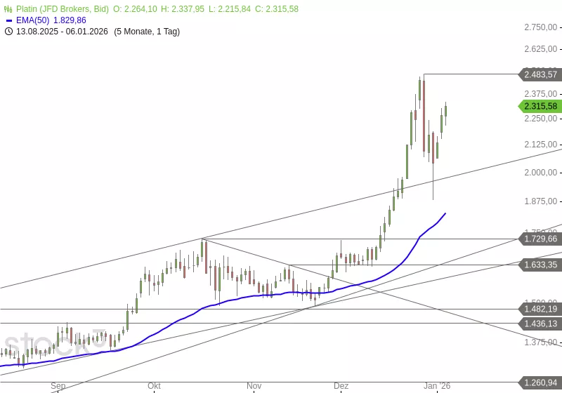Platin hatte nach dem starken Anstieg bis in den Bereich von 2.484 USD einen steilen Pullback vollzogen. In den vergangenen Tagen zeigt sich nun erneut eine beginnende Aufwärtsbewegung. Ausgehend von der Stabilisierung oberhalb der ehemaligen Trendkanaloberkante besteht die Chance, dass sich diese Bewegung zunächst in Richtung 2.484 USD fortsetzt.
