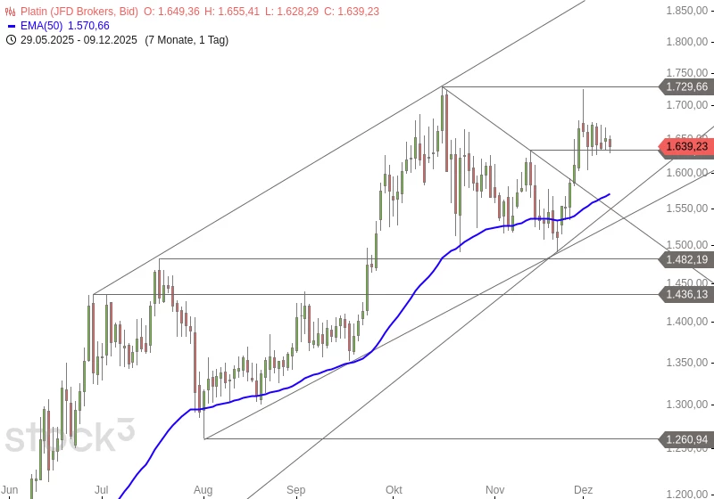 Platin löste sich in den vergangenen Wochen aus dem kurzfristigen Abwärtstrend und kehrte in den mittelfristigen Aufwärtstrendkanal zurück. Der Anstieg reichte bis 1.730 USD, wo der Kurs seither seitwärts tendiert. Die Unterstützung bei 1.633 USD bleibt kurzfristig entscheidend. Hält sie, ist ein nächster Anstieg in Richtung 1.875 USD und darüber hinaus möglich.