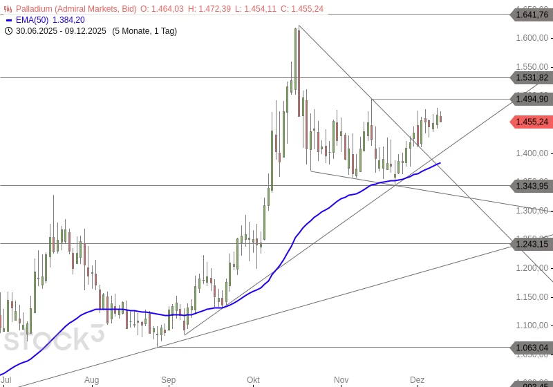 Palladium scheiterte im Oktober am Widerstand bei 1.642 USD und fiel anschließend in einem bullischen Keil bis zur wichtigen Unterstützung bei 1.344 USD zurück. Dort stabilisierten sich die Notierungen und konnten in den vergangenen Wochen aus dem kurzfristigen Abwärtstrend nach oben ausbrechen. Damit ist die Chance auf eine Fortsetzung der Aufwärtsbewegung grundsätzlich gegeben. Der nächste Widerstand liegt bei 1.495 USD.