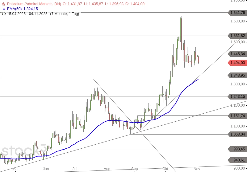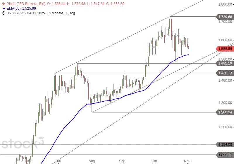 Platin konsolidiert nach dem Anstieg an der oberen Trendkanalbegrenzung weiterhin moderat seitwärts. Der EMA 50 sorgt derzeit für Stabilität, während im Bereich um 1.482 USD eine wichtige Unterstützung verläuft. In dieser Zone könnte sich Platin vorerst weiter einpendeln, bevor eine neue Aufwärtsbewegung innerhalb des Trendkanals einsetzen kann.