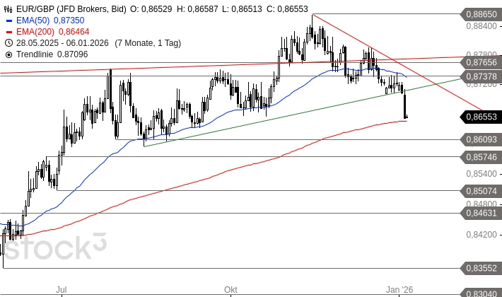 EUR/GBP geriet gestern stark unter Druck und gab den Aufwärtstrend seit 14. August 2025 auf. Am EMA200 (Tagesbasis) stoppte die Abwärtsbewegung zwar, aber eine Gegenbewegung zeigt sich bisher nicht. EUR/GBP könnte sich kurzfristig in Richtung 0,8710 GBP erholen und damit die gestrigen Verluste ausgleichen, aber danach wäre mit einem Rückfall gen 0,8603 oder sogar 0,8575 GBP zu rechnen. Neue, größere Kaufsignale ergäbe sich erst mit einem stabilen Ausbruch über 0,8766 GBP.