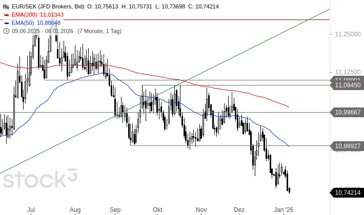 EUR/SEK brach am 08. Dezember aus einer mehrmonatigen Seitwärtsbewegung nach unten aus. Zwar kehrte das Währungspaar Mitte Dezember kurzzeitig wieder in diese Seitwärtsbewegung zurück, es fiel aber schnell wieder nach unten heraus. Gestern und heute Nacht kam es zu neuen Tiefs in der Abwärtsbewegung. Diese kann kurzfristig noch zu weiteren Verlusten in Richtung 10,6619 bis 10,6291 SEK führen. Hoffnungen auf eine größere Rally könnten sich die Bullen erst nach einem stabilen Anstieg über 10,8893 SEK machen.