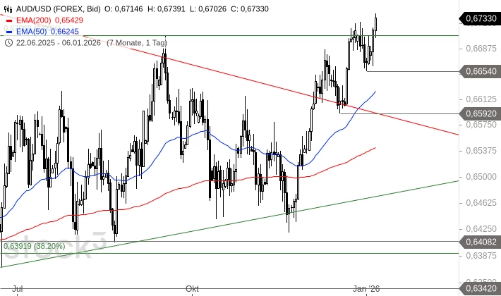 Ein Ausbruch über diesen EMA könnte den Weg an den Abwärtstrend seit 24. Dezember freimachen. Dieser verläuft aktuell bei 1,1765 USD. Sollte EUR/USD aber unter ein kleines Konsolidierungstief von heute Nacht bei 1,1710 USD abfallen, könnte es schnell wieder zu einem Rückfall unter 1,1702 USD kommen. Und dann wäre auch ein Rückfall an das rechnerische Ziel aus dem Doppeltop bei 1,1597 USD wieder möglich.