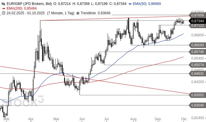 EUR/GBP markierte am 11. April ein Hoch bei 0,8738 GBP. Ende Juli 2025 attackierte das Währungspaar erstmals dieses Hoch. Seit einigen Tagen kommt es zu einer zweiten Attacke auf dieses Hoch. Knapp darüber, nämlich bei 0,8766 GBP liegt ein weiterer Horizontalwiderstand. Gelingt EUR/GBP ein Ausbruch über diesen Widerstandsbereich, dann wäre Platz für eine weitere Rally in Richtung 0,8979 GBP und damit an das Hoch dem Februar 2023. Ein Rückfall unter 0,8712 GBP wäre allerdings ein Hinweis auf eine Abwärtsbewegung in Richtung 0,8609 GBP.