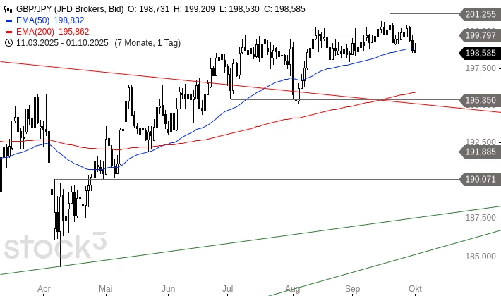 GBP/JPY brach am 12. September über den Widerstand bei 199,797 JPY nach oben aus. Dieser Ausbruch bot das Potenzial für eine weitere Rally. Allerdings wurde dieser Ausbruch wieder abverkauft. Gestern fiel GBP/JPY unter den EMA50 (Tagesbasis) zurück. Heute versucht sich das Währungspaar darunter zu etablieren. Damit deutet sich eine weitere Abwärtsbewegung in Richtung 195,35 JPY an. Eine schnelle und dynamische Rückkehr über 199,797 JPY würde aber wieder eine Rally bis 203,813 JPY und 208,105 JPY ermöglichen.