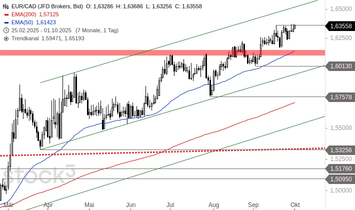 EUR/CAD hat sich in den letzten Tagen über der Widerstandszone zwischen 1,6105 und 1,6152 CAD etabliert. Dabei kam es zu einem Hoch bei 1,6359 CAD. In dieser Woche drückt das Währungspaar gegen dieses Hoch. Ein Ausbruch darüber würde auf eine Rallyfortsetzung bis zunächst ca. 1,6525 bis 1,6550 CAD und später an das Allzeithoch bei 1,7513 CAD hindeuten. Sollte EUR/CAD aber an diesem Hoch abprallen, müsste mit einem weiteren Rücksetzer an die durchbrochene Widerstandszone gerechnet werden.
