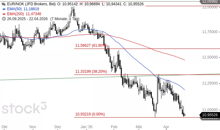 EUR/NOK fiel gestern auf das Jahrestief bei 10,9322 NOK zurück und verteidigt dieses bisher. Aber lange sollte dieses Tief nicht halten. EUR/NOK kann jederzeit darunter abfallen und in Richtung 10,7032 oder sogar 10,5153 NOK abfallen. Erst ein Ausbruch über den Widerstandsbereich um 11,3320 NOK wäre ein klares Kaufsignal.