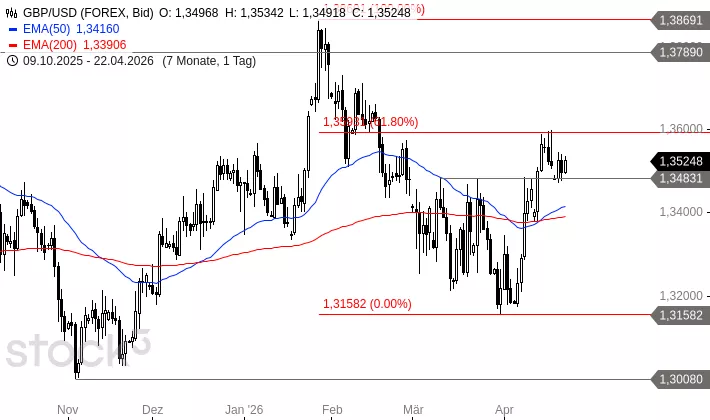 GBP/USD brach am 13. April über den Widerstand bei 1,3483 USD aus, scheiterte aber sofort an der nächsten Hürde bei 1,3593 USD. Seitdem bewegt sich das Währungspaar zwischen diesen Marken seitwärts. Ein Ausbruch aus der kleinen Range nach oben würde Potenzial in Richtung 1,3789 und 1,3869 USD freisetzen. Ein Rückfall nach unten würde auf Abgaben in Richtung 1,3158 USD hindeuten.